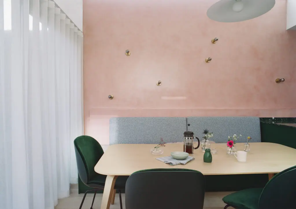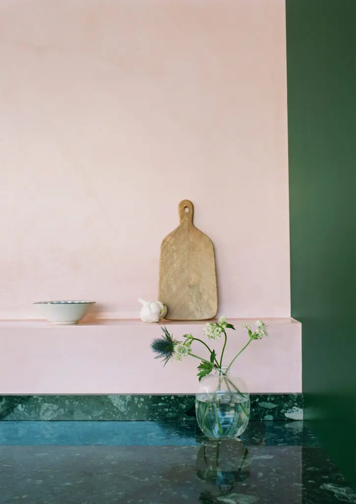 For the north-facing kitchen Space A wanted a ‘Puck’ green, a magical, mischievous colour to reflect the quirky nature of the house, with its arched windows and cubby holes. They felt the conglomerate to be an edgy and current surface, a bright counterpoint to the serene textures of the walls in soft pink polished plaster and pale oak flooring.