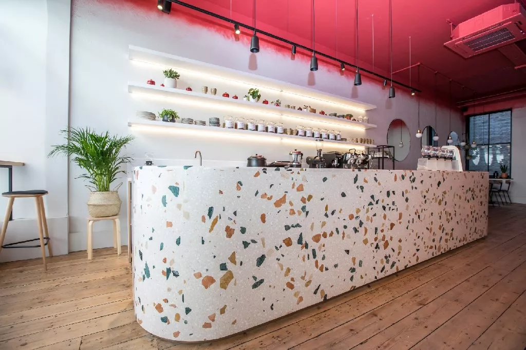 As a unique endeavour, the interior of the tea bar called for something just a little special. This turned out to be one of Diespeker’s newer terrazzo designs, TE081, commissioned to provide a vibrant and eye-catching counter.