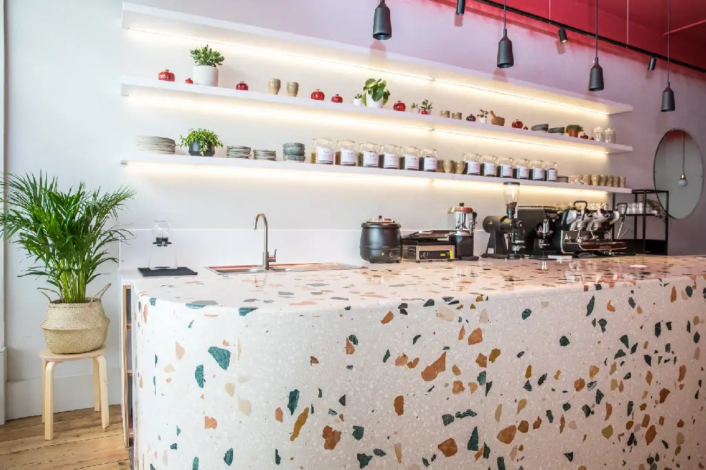 As a unique endeavour, the interior of the tea bar called for something just a little special. This turned out to be one of Diespeker’s newer terrazzo designs, TE081, commissioned to provide a vibrant and eye-catching counter.