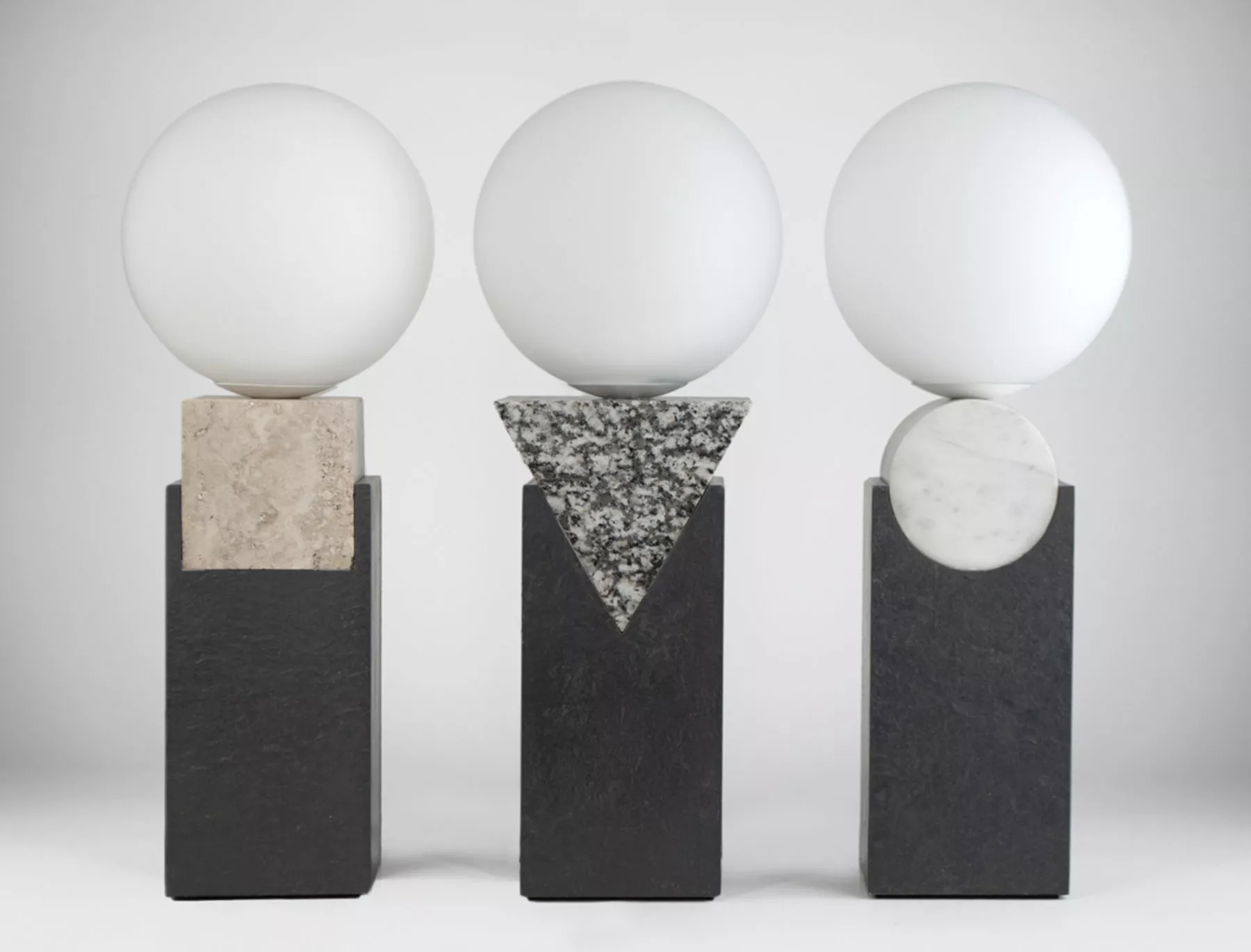 For his ‘Monument Lamps’, Louis took inspiration from monoliths and monuments, exploring the theory of what a column is, using simple geometric shapes to symbolise the capital of a stone column to create a formal table lamp.