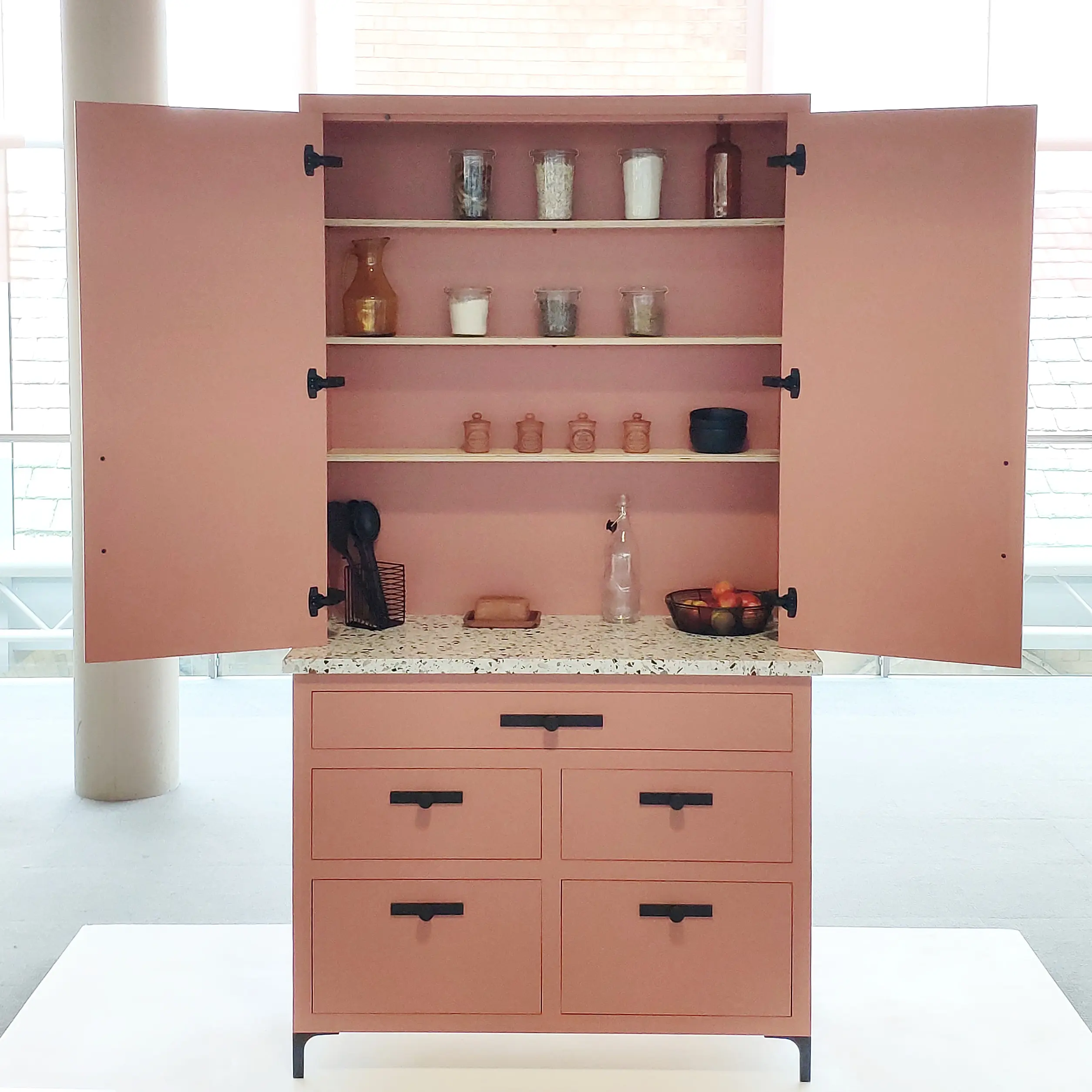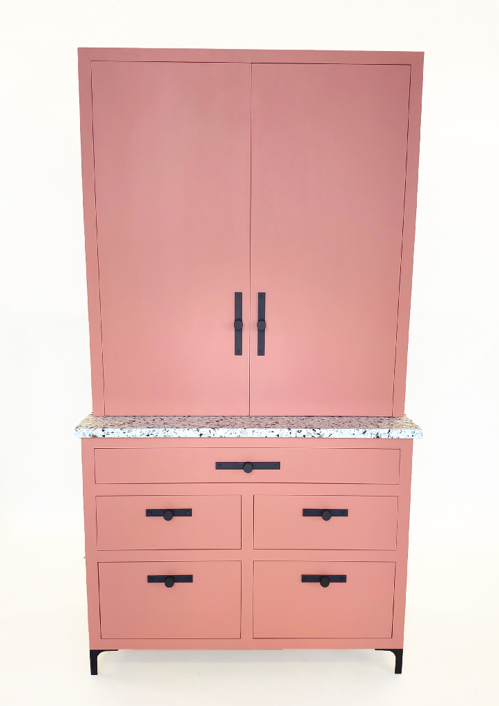 At the time Amy was studying Furniture and Product Design at Nottingham Trent and as part of her course, made a freestanding kitchen larder. She used terrazzo TE007 for the worktop, which worked well with her other materials, Farrow and Ball Red Earth paint, reclaimed birch plywood and matt black hardware.