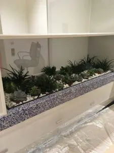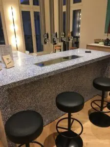 This latest project included three counters in bespoke resin based terrazzo adding a unique flavour to the different floors, variously used for a reception desk, kitchen and pantry countertop and a bar surface. The terrazzo was made in the Bermondsey factory using blue glass specially sourced from China with small white Carrara marble chippings in white resin background.