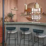 Another unusual feature of the bar is a triple arc to the frontage, reflecting the wall feature scalloped timber slats. This seductively curved façade highlights the sweeping camber of the surfaced.