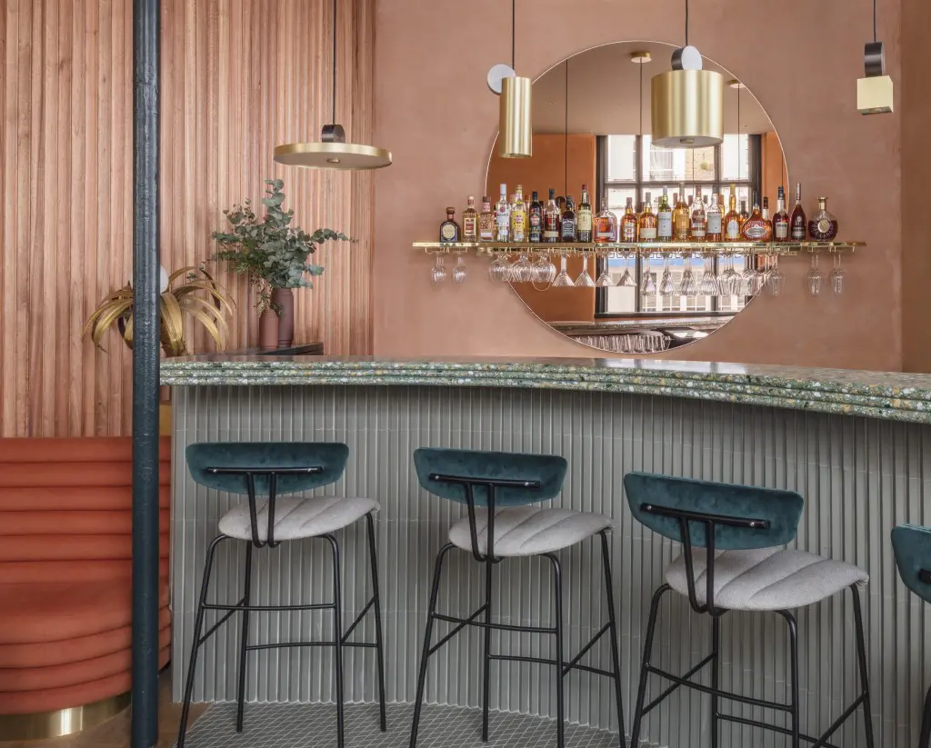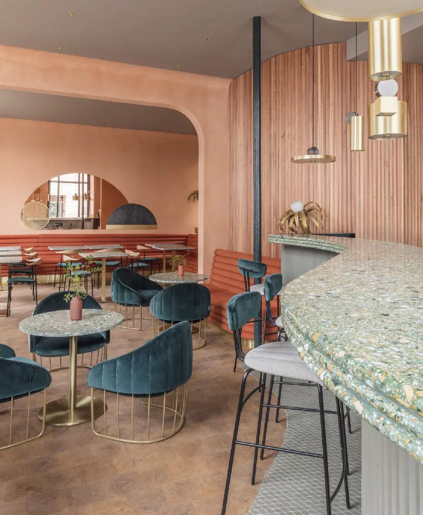 The design team chose a standard plus terrazzo design for the tables and bar counter to meld perfectly with an earthy, Mediterranean theme that includes terracotta walls and wooden floors, to achieve a warm and welcoming ambience.