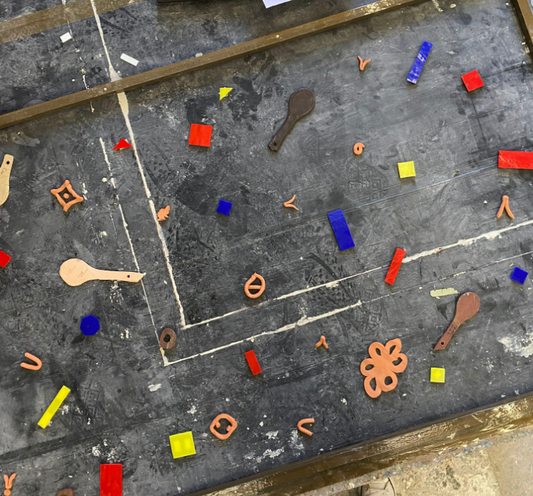 As well as ceramic, the design uses primary colour glass pieces; yellow, blue and red. The concept came from her house which has stained glass windows – on sunny days beams of light shining through the glass makes shapes on surfaces, which she wanted to replicate.