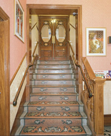 The design is extremely intricate, with beautiful mosaic illustrations of instruments including a lute, lyre and the classic tragicomedy masks associated with Greek theatre. Impressively, the mosaic design continues right up the stairs. And here, there is the evidence that Diespeker created the surface, as on the very last riser there’s a logo announcing: “Diespeker’s Patent”.