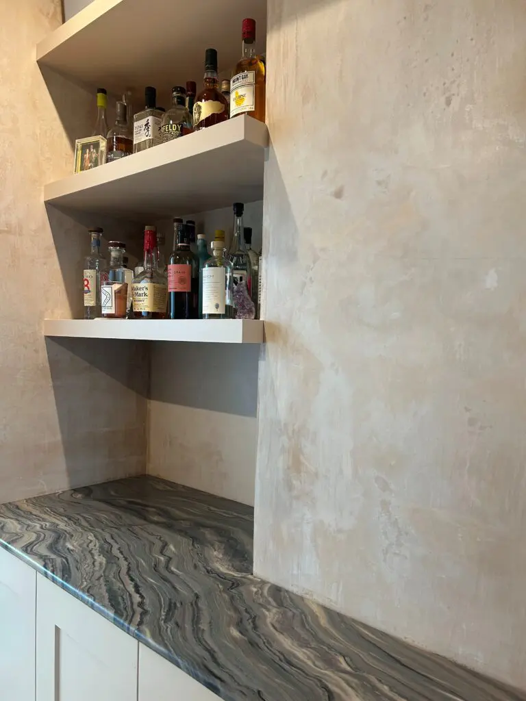 The search for a perfect countertop for the bar brought Emily to Diespeker. She was familiar with the name, as where they previously lived in Angel was close to Graham Street, once Diespeker’s main premises. Emily kept seeing the Diespeker & Co logo, which remains on the building (learn more about this from Ghost Signs). She noticed Diespeker’s current location was just down the road from her new home and cycled over. “I’d been prepared to drive out of town to find the marble, so I was amazed to find this, right in the heart of London.” After being shown around, she returned with Brian to choose their ideal stone.