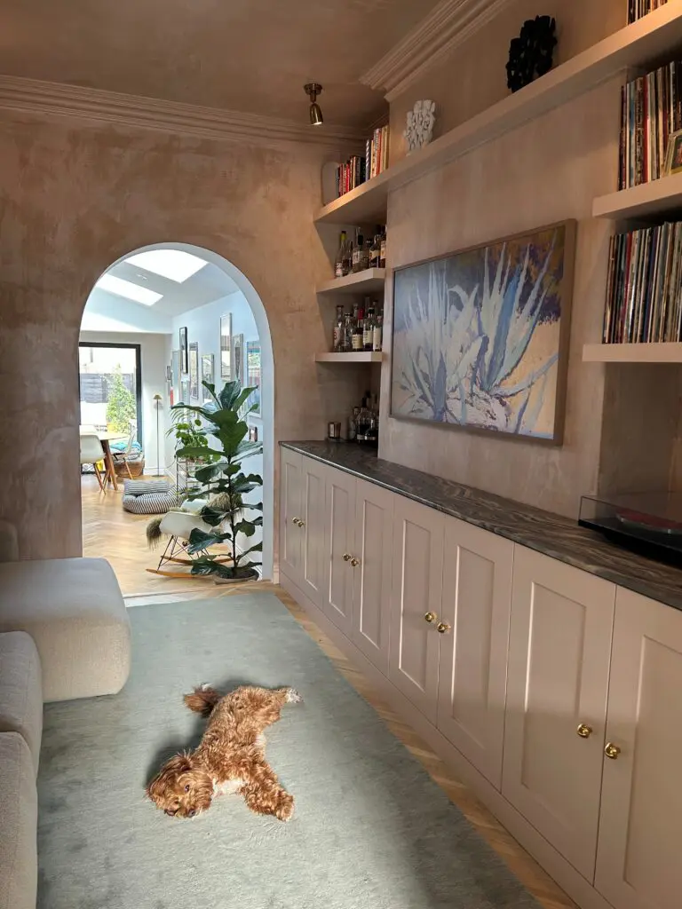 They decided to update the living space, building an arch to connect two smaller rooms. One of these had become a catch-all, used for storage and as a playroom, but then transformed this into a ‘snug’ for relaxing, complete with TV, record player, vinyl collection – and a bar!