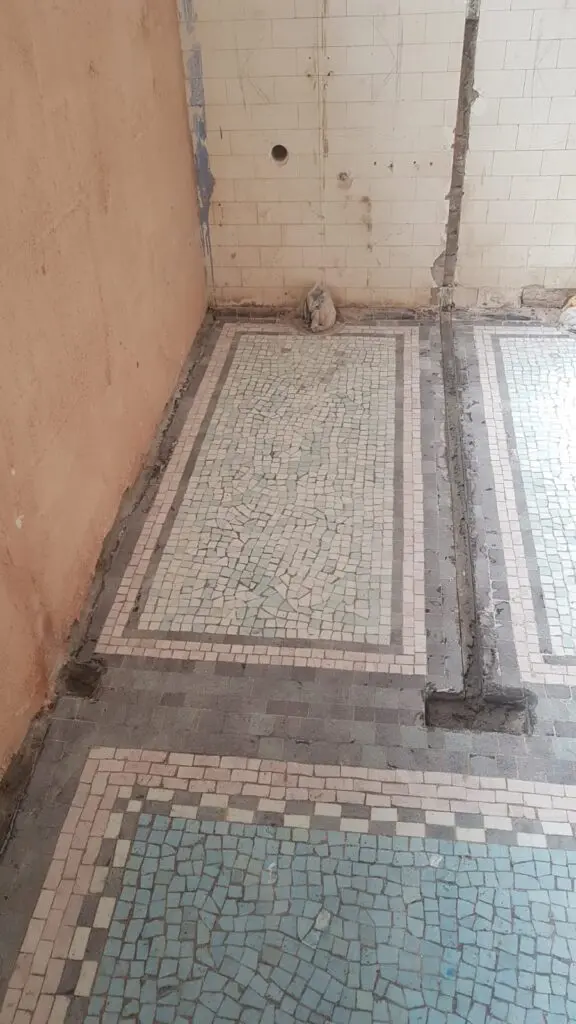 Hollywell Building Services were carrying out refurbishment works at the stations, including the toilets. The toilet floors had been coated at some point with a levelling compound. It became apparent to the Holywell team that there was something of interest underneath so Holywell called Diespeker in to check it out. After careful investigation, we suggested removing the compound and once the floors were taken up, lovely mosaic flooring was revealed underneath.