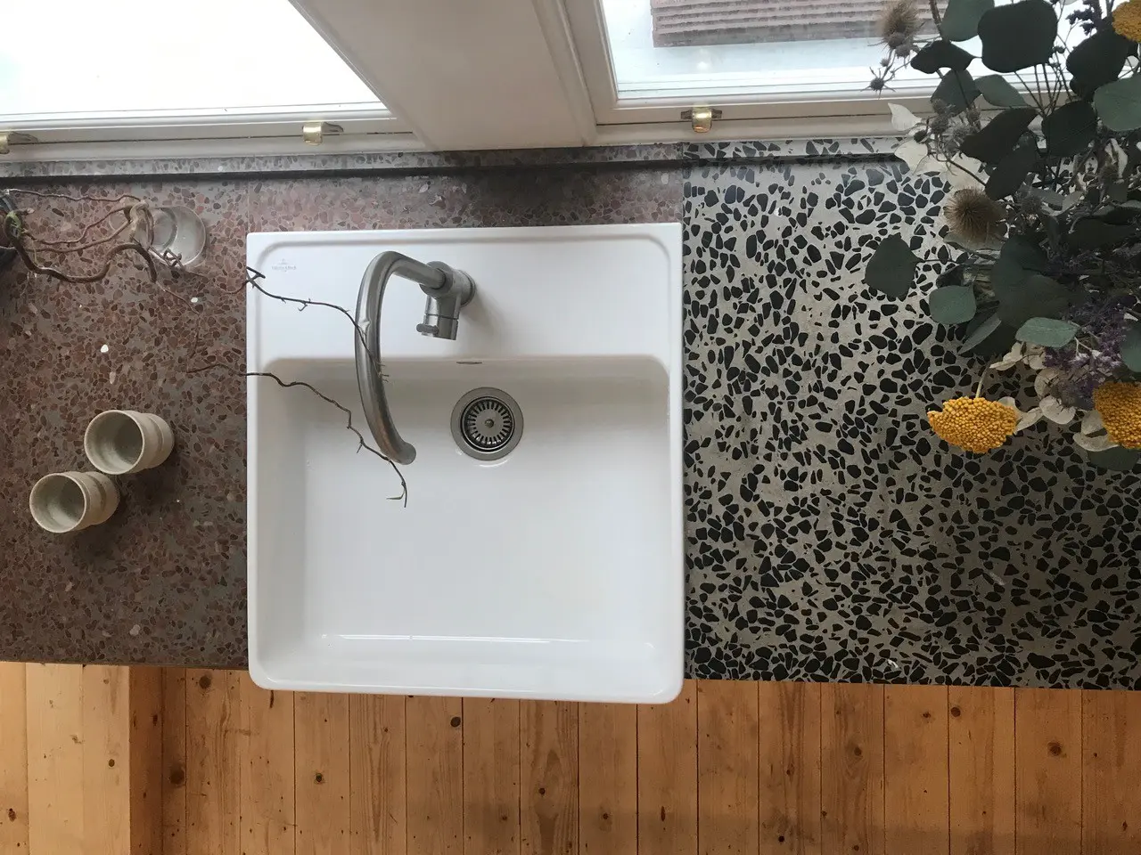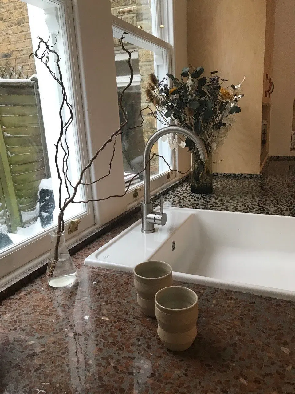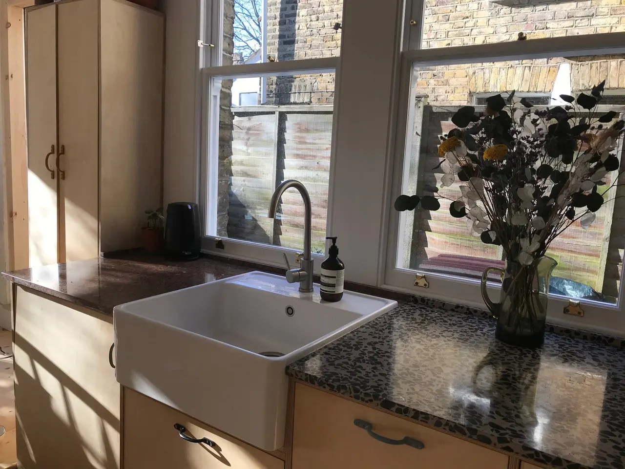 Their plan for the kitchen was to develop it into a living space, not just for cooking but a place to relax, too. Rebecca was keen on looking at using terrazzo for the kitchen countertops as it has a beautiful finish. With an eye on sustainability, she thought that offcuts might provide the answer. Having researched various companies, she decided to approach Diespeker to discuss options for kitchen countertops. She said: “Out of all the companies, Diespeker looked very approachable!”