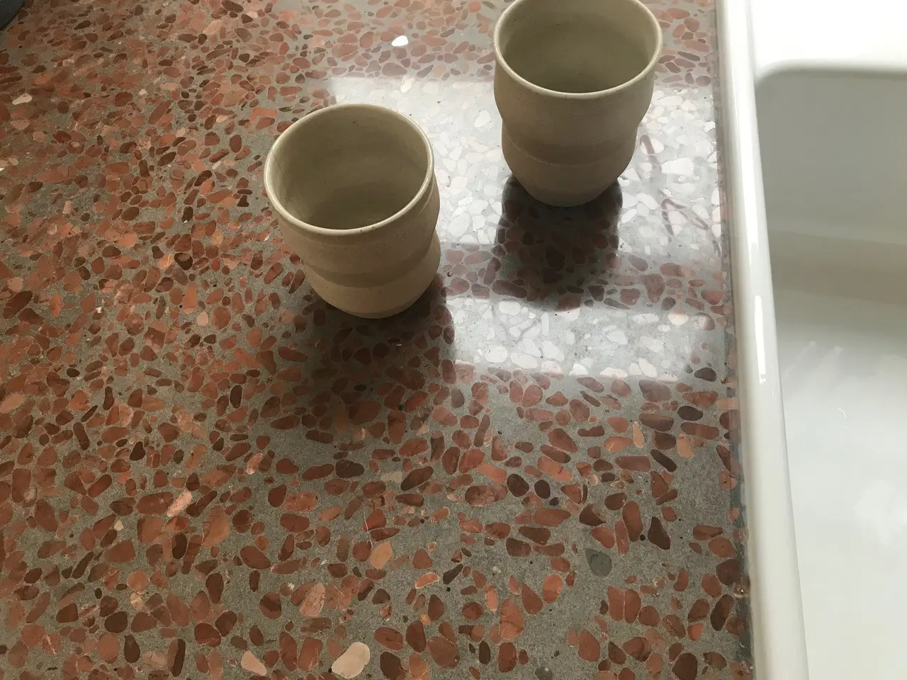 Visiting the yard in January 2020, they met Diespeker MD John Krause and discussed their idea. John was supportive of the concept and like the idea that the terrazzo offcuts could be used so imaginatively. But it wasn’t until November 2020 that they were able to return to see what was available. “We spent three hours at the yard, as there was so much to see! We were looking for more interesting offcuts – Monty had made templates for the countertops so we knew what we needed to cover.”