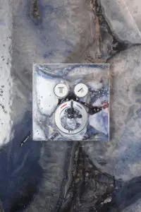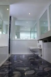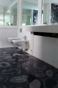 However, the star of the show is undoubtedly the floor, a stunning surface of blue agate. Blue agate is often associated with calmness and is said to release tension and encourage relaxation – perfect for a bathroom.