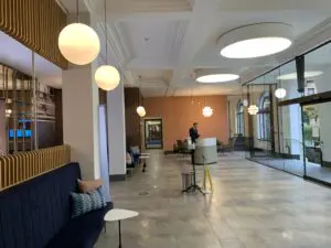 The works included reconfiguring the reception area to create new features: a business lounge, concierge desk and collaborative workspace. The area connects the building with Parsonage Gardens offering an outdoor space for the use of tenants and their visitors.