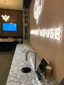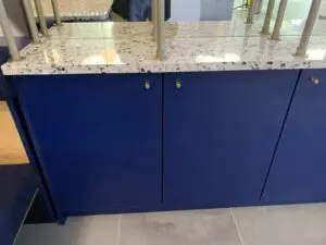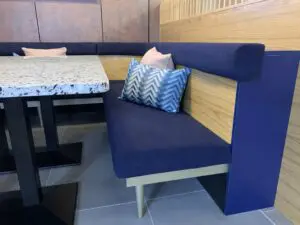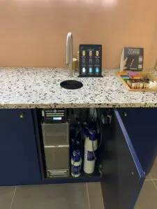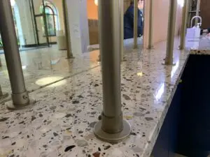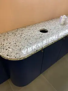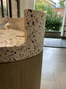In addition, three separate terrazzo pieces were supplied for the tea bar and joined on site. Features included two holes cut into the terrazzo for the main worktop, one for a bin chute, the other a water trap with a swan neck tap integrated for the coffee making facility. A practical area for the condiments tray was cut into the terrazzo. The final terrazzo element was a table top for the collaborative workspace, with rounded edges. All terrazzo pieces were given a final polish on site.