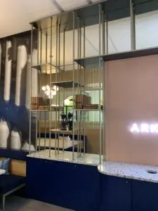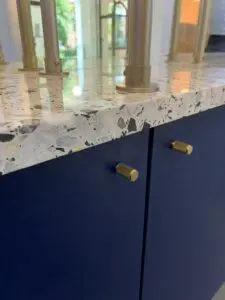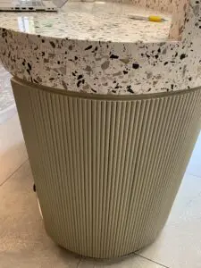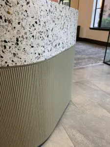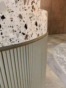 The result was a stunning compact concierge desk with curved terrazzo top and screen, and a base made by Nationwide Retail Solutions using MDF and timber, with mouldings sprayed to look like brass, individually glued on.
