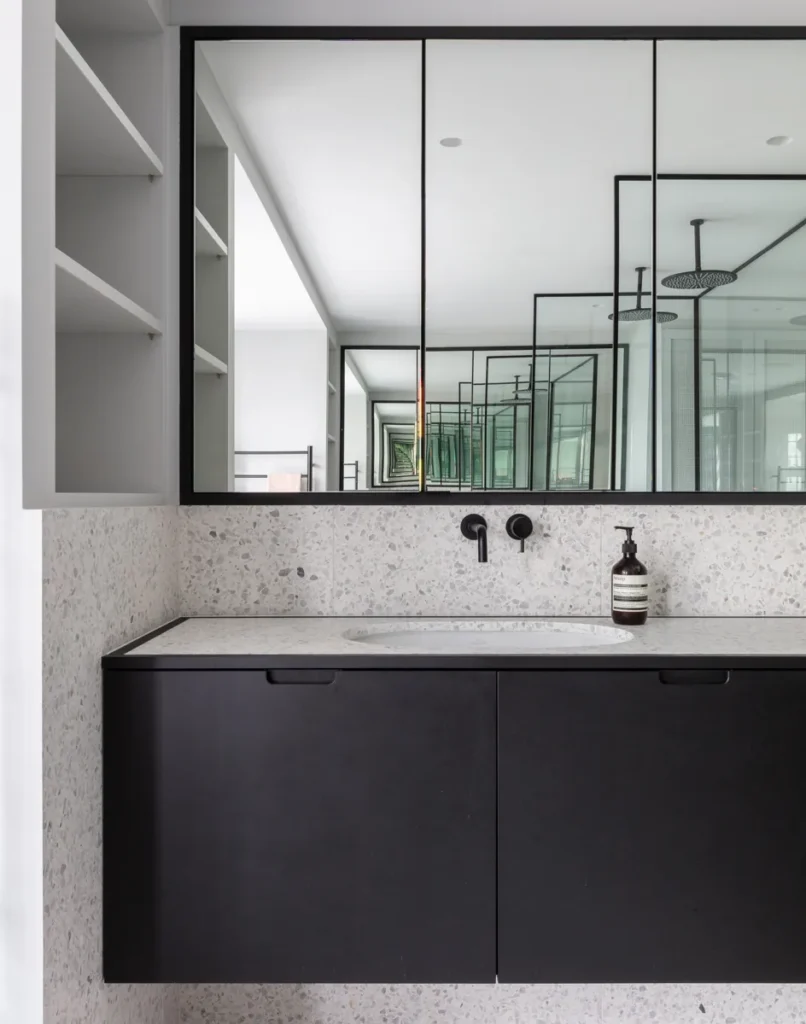 In the master bathroom, terrazzo TE018 was the choice for floors, cladding and countertops. A neutral terrazzo, it works perfectly within the monochrome setting which includes black Richlite for the unit doors.