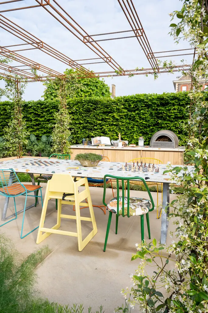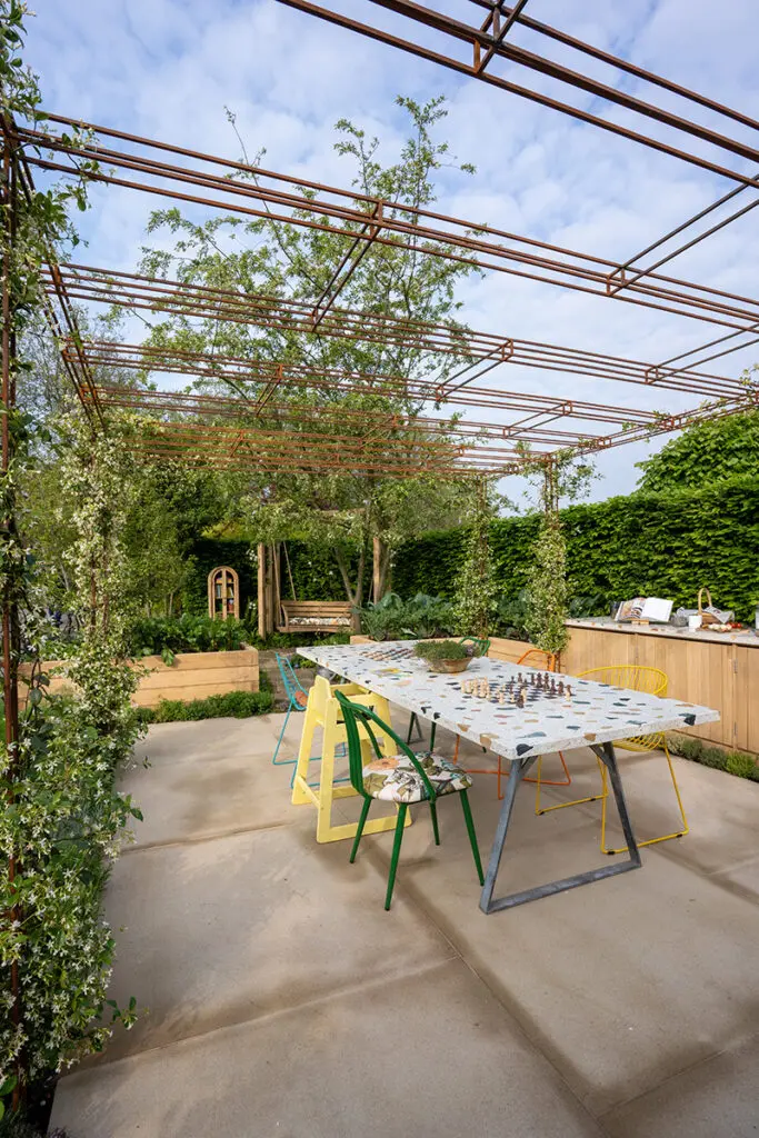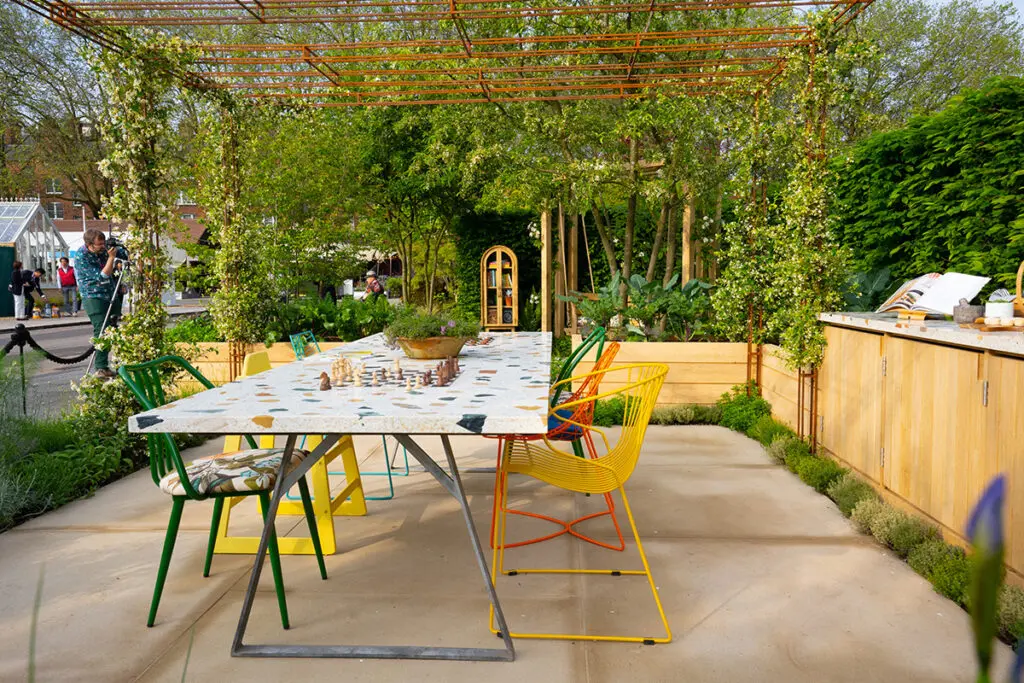 The table was an instant success. Rachel de Thame said on the BBC RHS Chelsea Flower Show programme: “What I’m so impressed by straight away is the large garden table, right in the middle. They’re not shying away from the fact that the table is key; a beautiful surface, made of a terrazzo. I especially love these, the chess boards that are set into the tabletop, so that it’s not only a space to eat, but a place to play, chat and read.”
