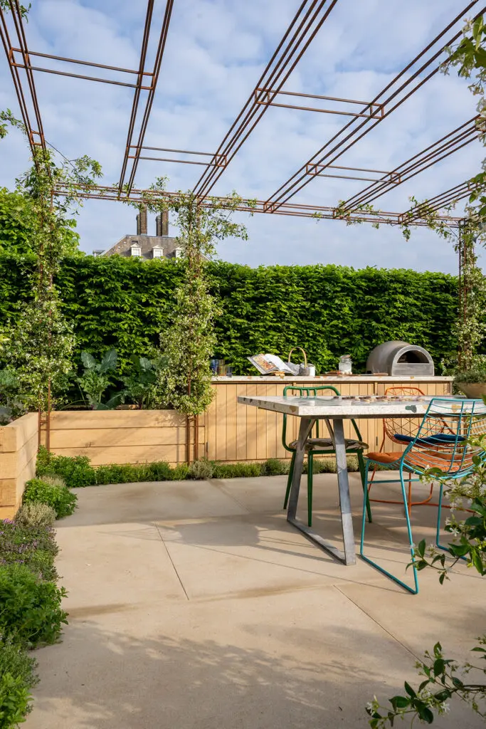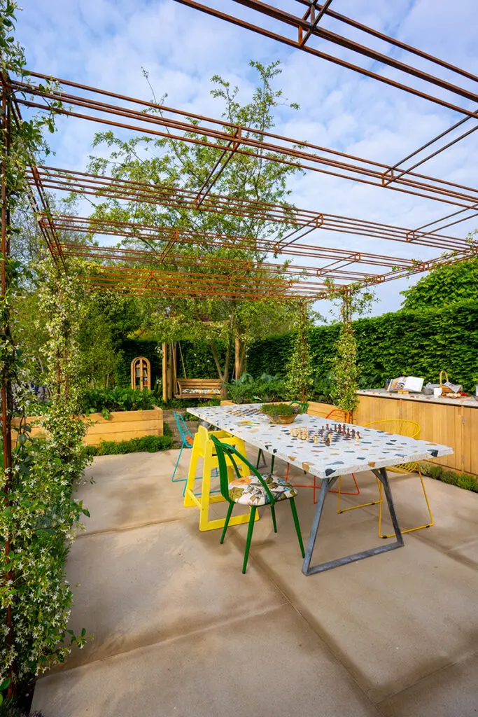 He created two distinct areas in the design. The first, a welcoming place to meet up with an outdoor kitchen and huge table under a pergola. Stylish upcycled chairs were designed by TV presenter and furniture restorer Jay Blades at his workshop, Jay & Co. James wanted the chairs to give a sense of inclusivity. “They suggest ‘everyone’s welcome’ – and people really smile when they see them.”