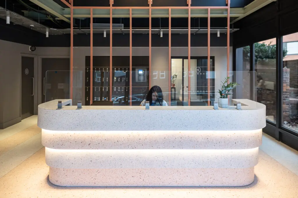 Manufacturing the desk presented a double challenge to the team. Not only were there four separate tiers, but the design featured a curve. It was created using resin terrazzo with two tiers formed from neutral terrazzo TE001 and the other two using TE004 with warm pink tones.