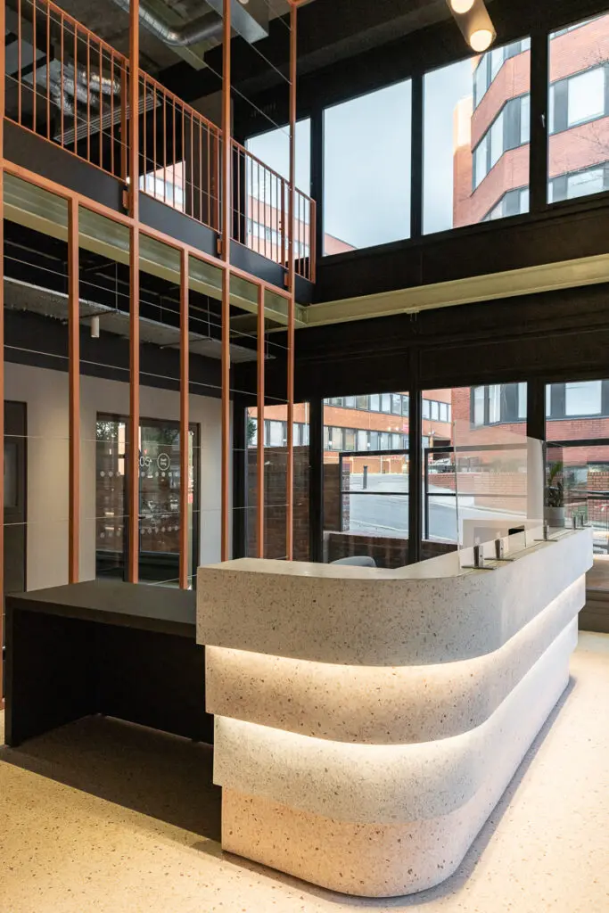 However, the most challenging element for the Diespeker team was the reception desk at the entrance, the part of any building that creates the first impression for users and visitors. Nothing says more about a business than first impressions and this desk certainly fits the bill, with its contemporary curved, four tiered design including LED lighting on two of the tiers to give a warm welcome to users and visitors.