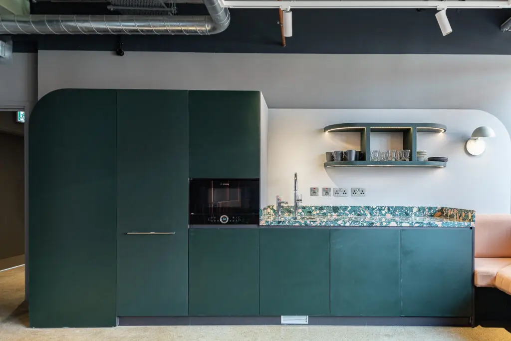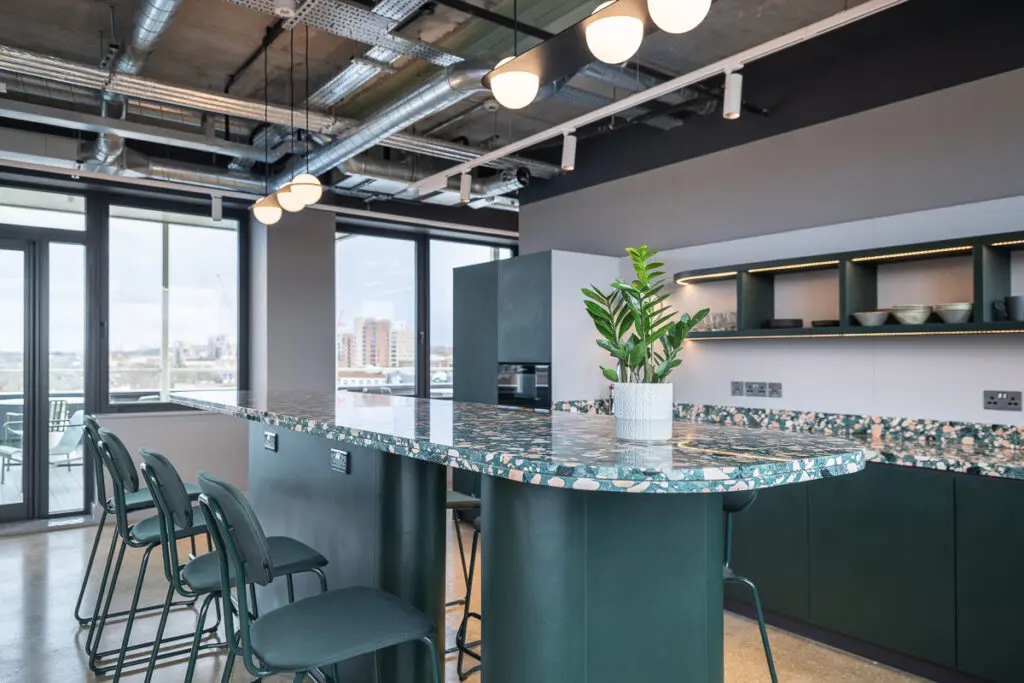 Interior design was down to Hawkins Brown who tackled the stark building by introducing a ‘green route’ running from the entrance, with a garden trellis frame rising up through the atrium, to the roof terrace with its views of the green surrounds including Alexandra Park. Reflecting this, Diespeker provided the eye-catching green-based terrazzo TE107 for the kitchen areas, including countertops and seating island.