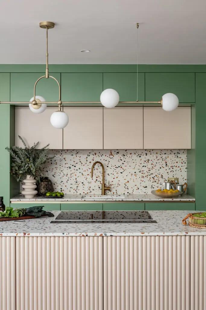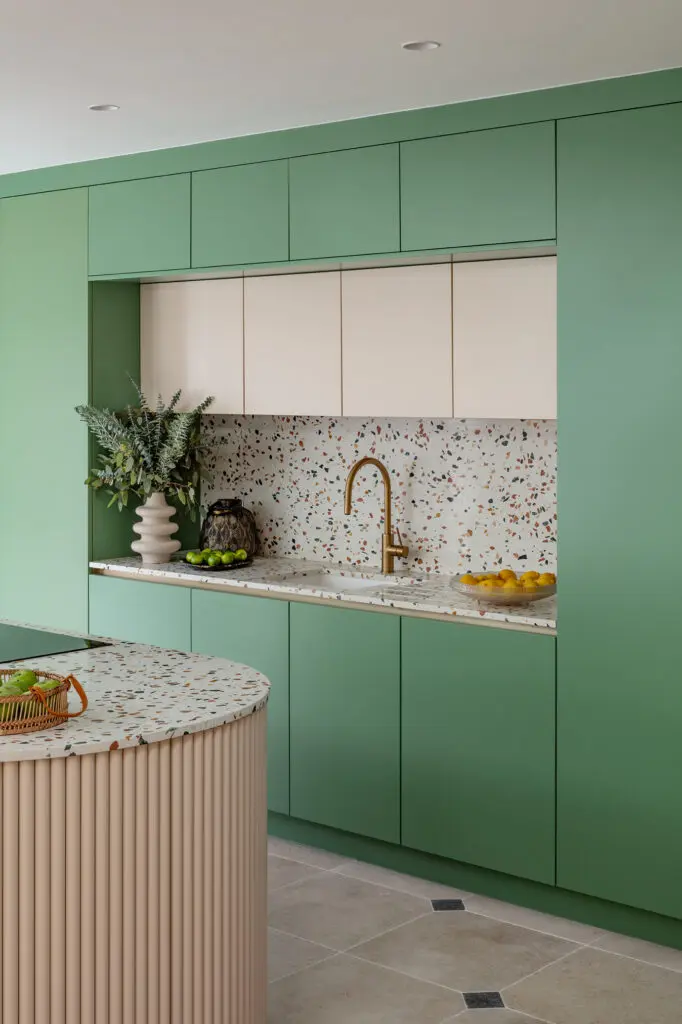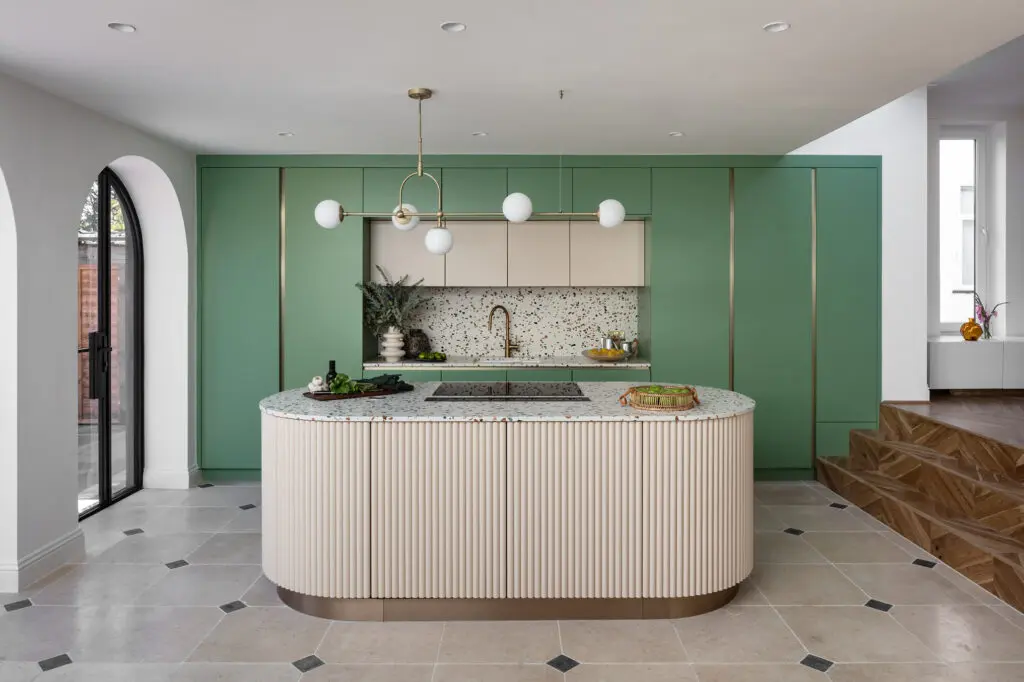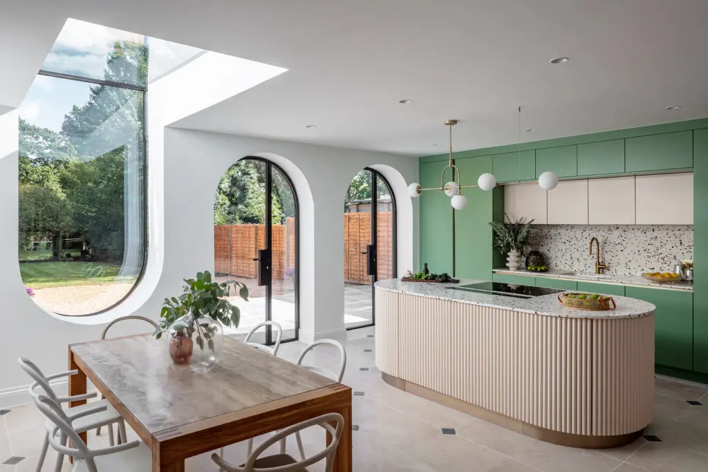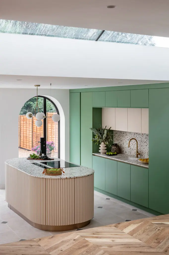The terrazzo was used for two countertops, one for the sink area which included drainage grooves and a large splashback and the other a pretty, curved island which echoes the attractive and unusual curves in the windows and door of the extension (the home has been renamed nnU House to reflect this). The elliptical island is wrapped with timber flutes created by bespoke kitchen maker Sheraton Interiors.