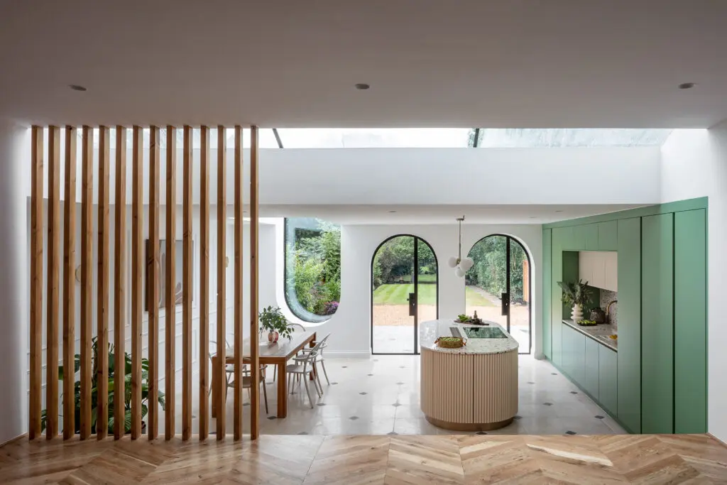 “It’s quite a unique site; the property has an enormous garden over 300 feet long, much larger than neighbouring properties. The existing internal layout included a narrow galley kitchen with a small extension which was used as the dining room to the rear. A set of narrow steps led down into the garden where there was a large outbuilding obstructing the view and reducing natural daylight into the house.”