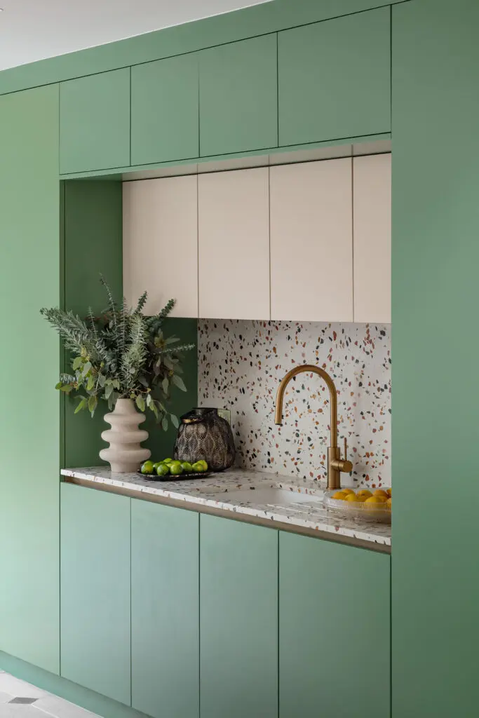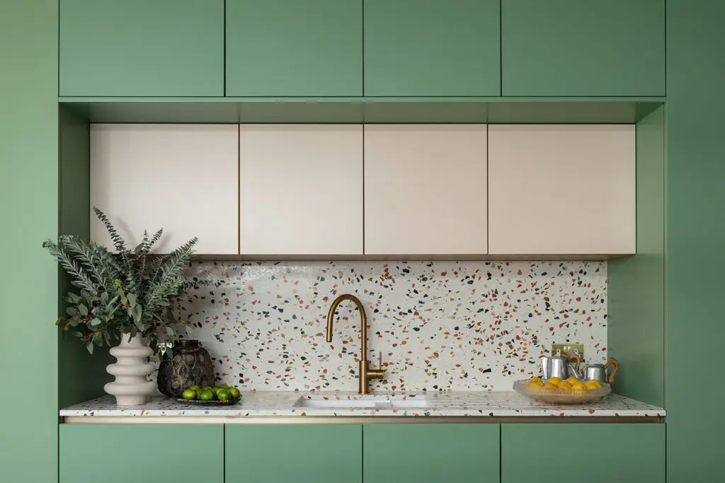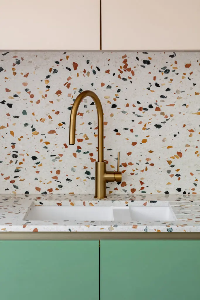 The chosen terrazzo was Diespeker’s cement based TE084A, which has proved to be extremely popular since its introduction to the range. It’s a versatile design that works well with a wide range of interior styles and colour palettes, giving a real pop of joy, ideal for this couple with challenging jobs who desired a space for relaxing with a bit of fun and playfulness for their two children. Mahdi agrees. “The terrazzo design works well within the space, complimenting the natural materials used within the design, including the wood and limestone flooring and the garden outside.”