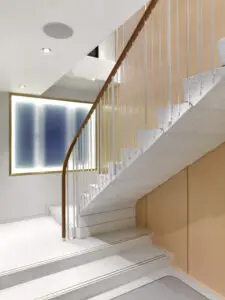 A further design feature required a complicated brass nosing detail to the treads. When each stair had been cast, Diespeker’s CNC was utilised to cut two grooves on each tread, connected at both ends with a half circle. 10 x 20mm brass strips were set into the groove as a continuous loop. The look of the impressive cantilevered stairs was enhanced by a subtle, leather wrapped handrail.