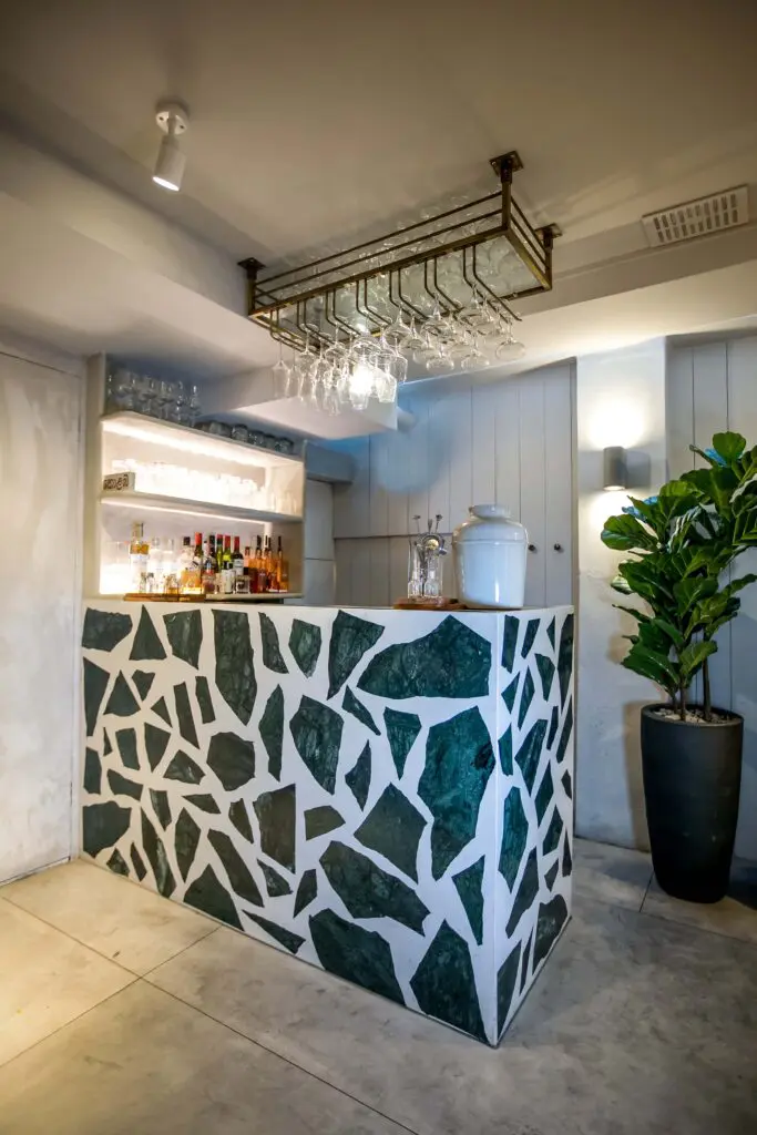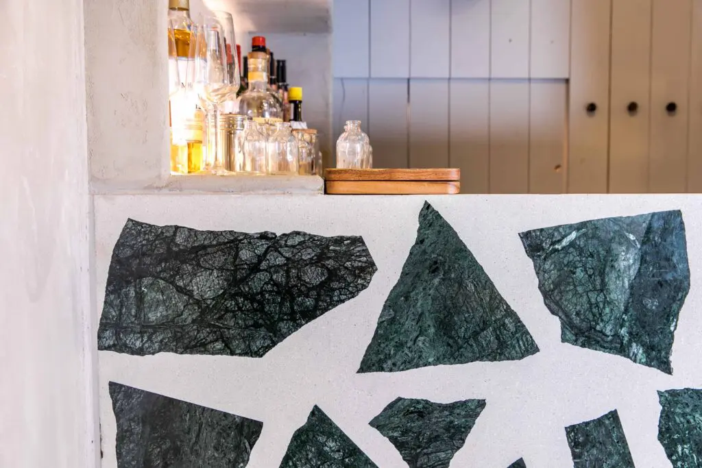 Annie was looking for two terrazzo designs using the same teal-blue/green marble. The first was for tabletops and the ground floor open-kitchen dining counter using smaller 15 to 20mm chippings in a cement base; the second, an impressive large-scale cocktail bar, for which Annie wanted larger 200 to 300mm chunks of marble set in white resin terrazzo. This is an unusually large specification for single chippings, creating a striking and highly unique look. Part of Annie’s inspiration was to use offcut pieces of the marble to meet sustainable aims.