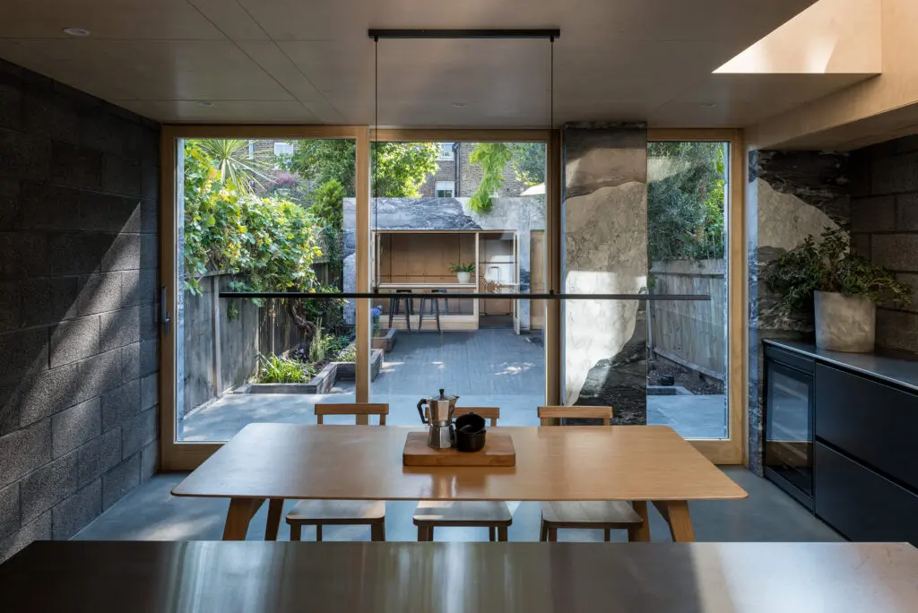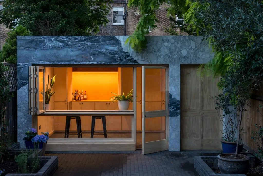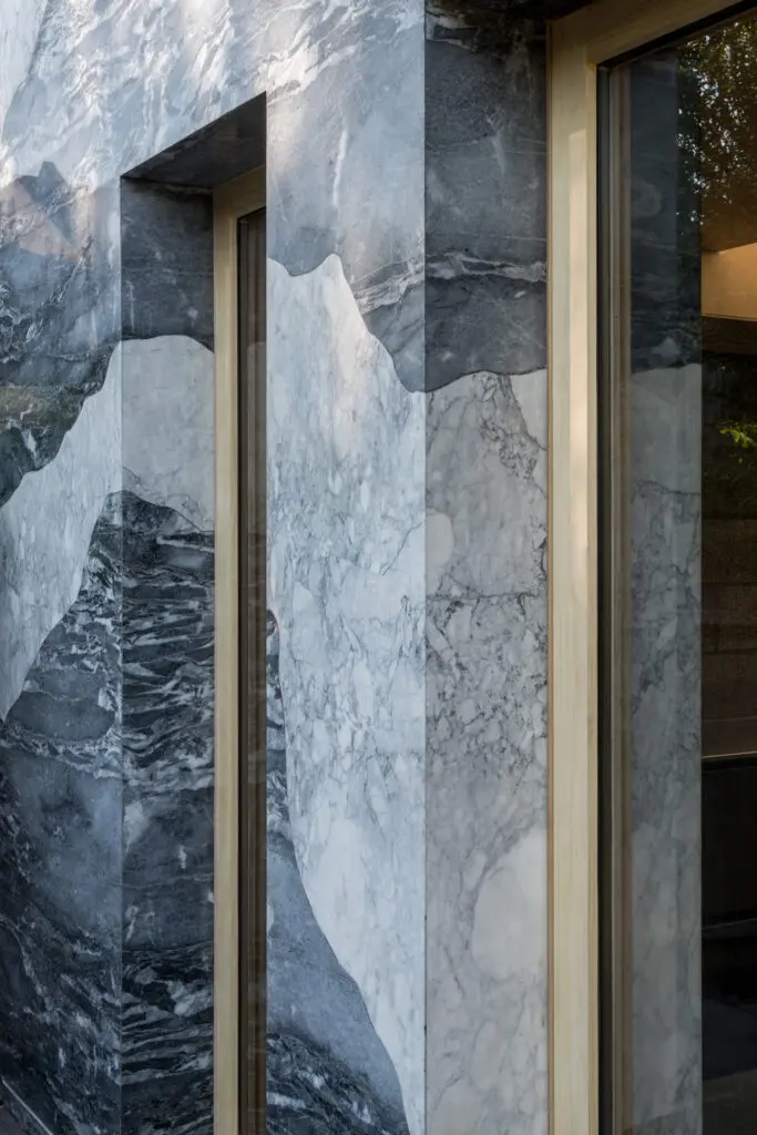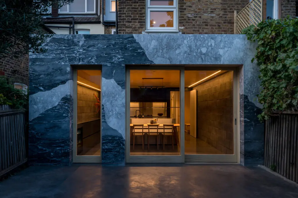 The project called for two new marble-clad single-storey spaces to be added to a Victorian mid-terrace home in East Dulwich to give the homeowners a practical solution for additional space. Initially the design team looked at creating the cladding from a bespoke terrazzo, but after considering the options, they switched to marble. 16.5sqm of external cladding was needed for the two structures, a kitchen-diner extension including utility and WC and a stand-alone garden room incorporating home office, bar and an area for socialising.