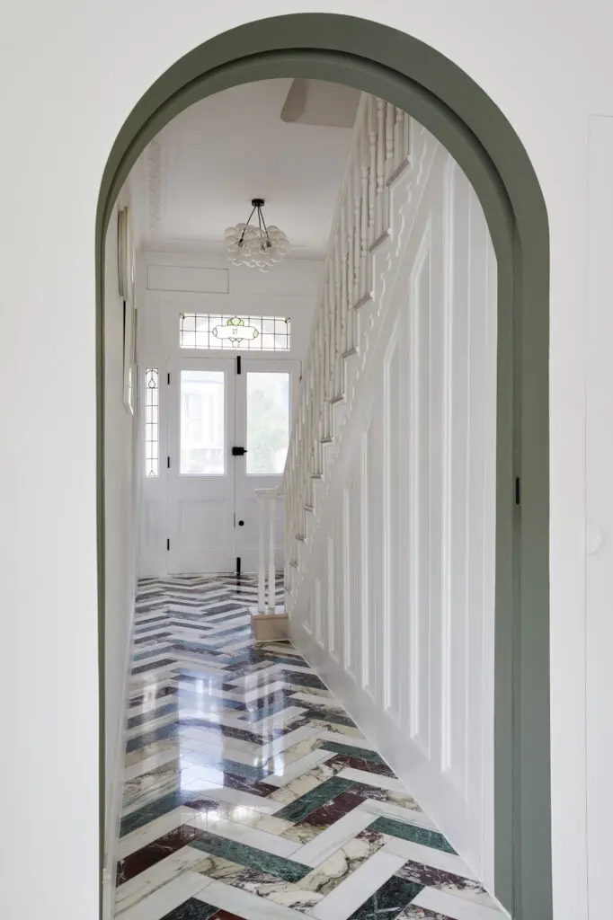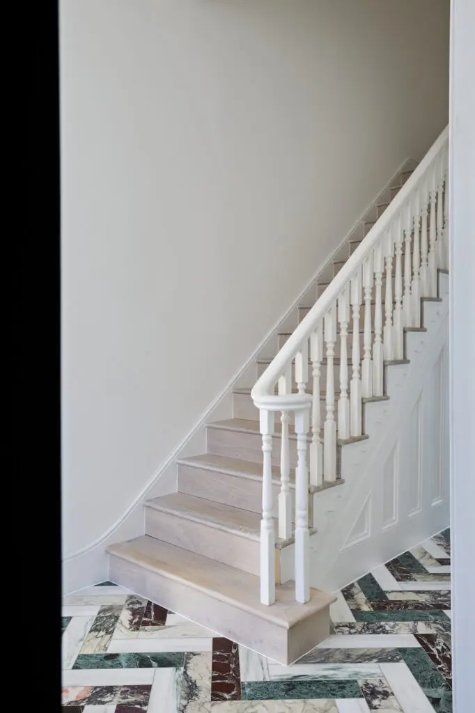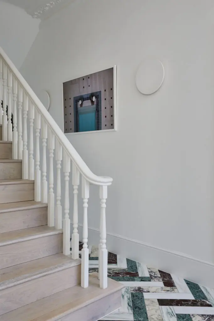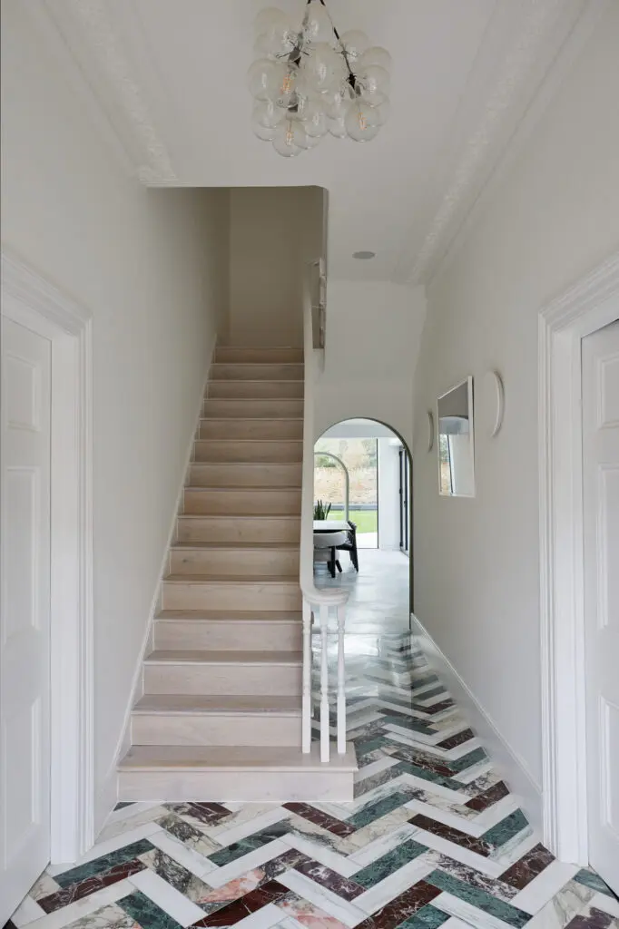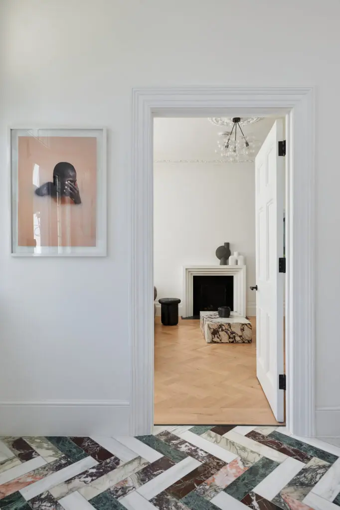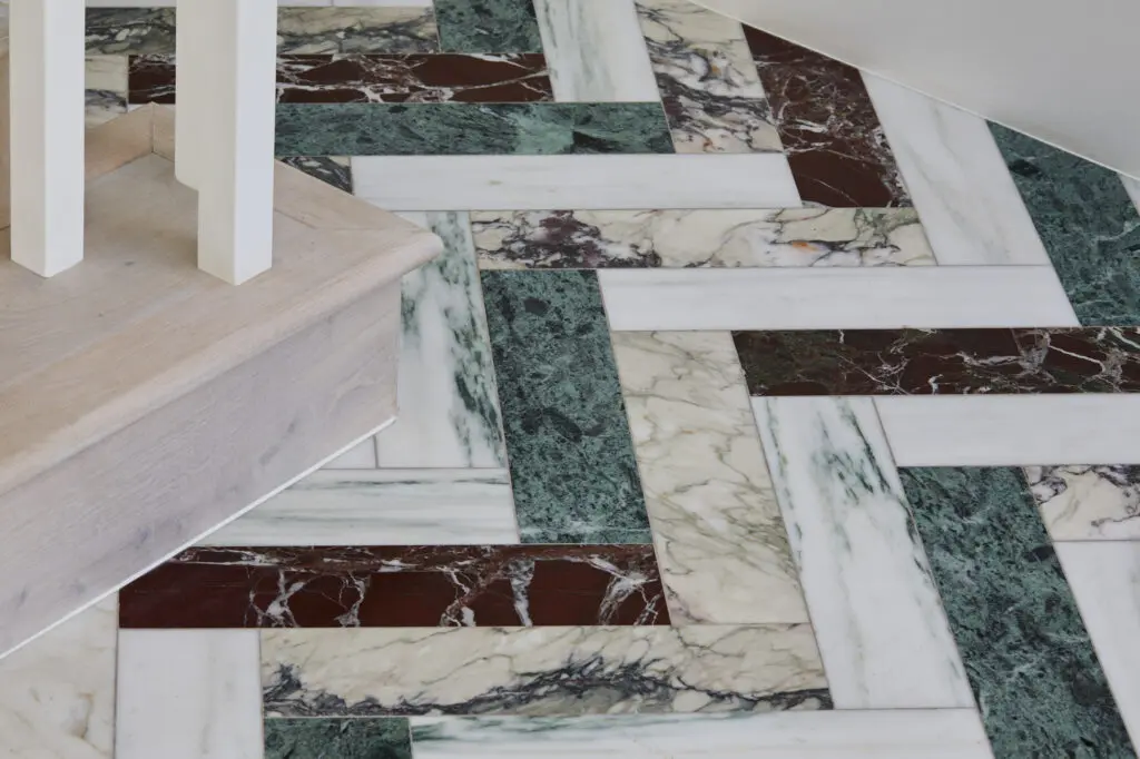 For the South London floor, the creative brought a different twist, with the marble slabs installed at an angle to create a unique herringbone parquet design. The client visited Diespeker with Gruff Architects to pick out the marbles, choosing Pentelikon, Bianco Fantastico, Rosso Levanto and Verde Guatemala to give a mix of grey, white, red and green hues.