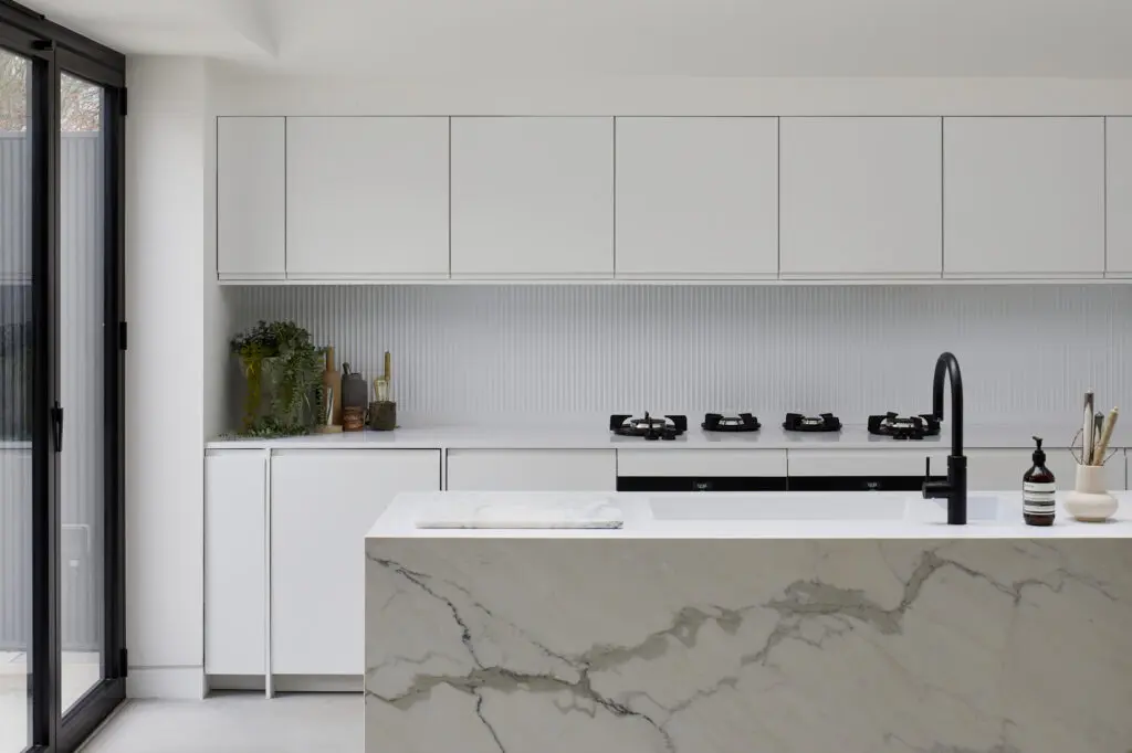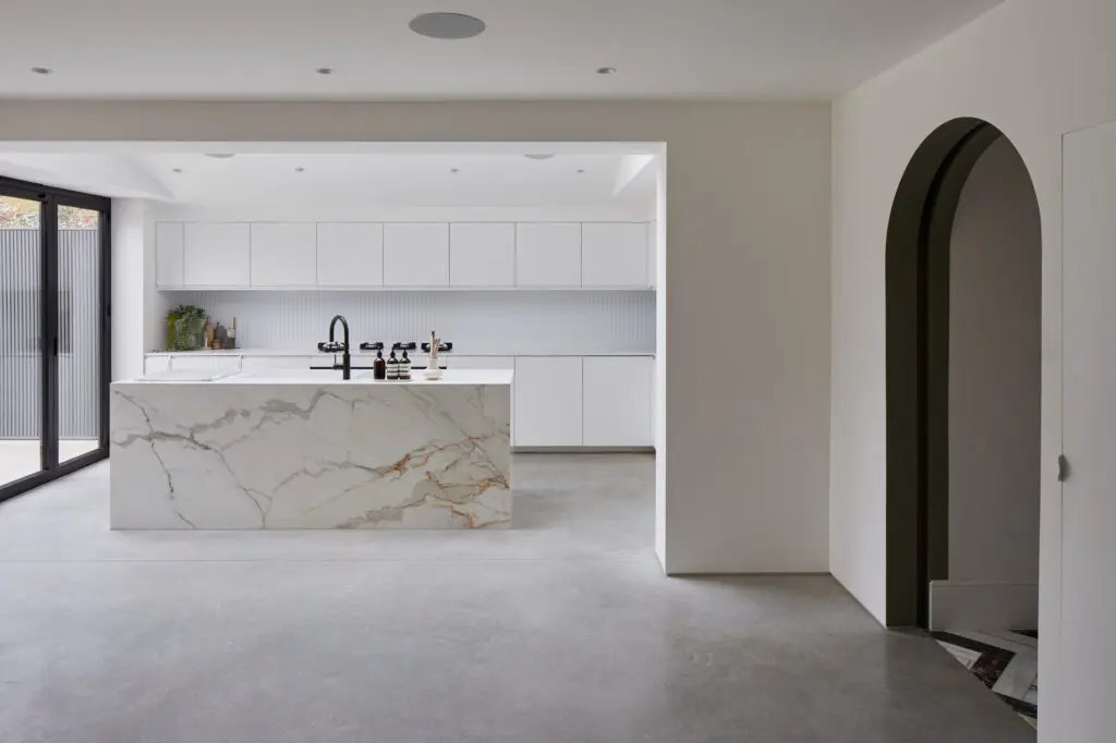 Gruff Architects created a single storey extension to a South London home for an owner with a cinematic eye for design. The concept featured a monochrome palette throughout, with a pop of colour in the hallway flooring, an unusual and striking parquet-style design showcasing four different marbles.