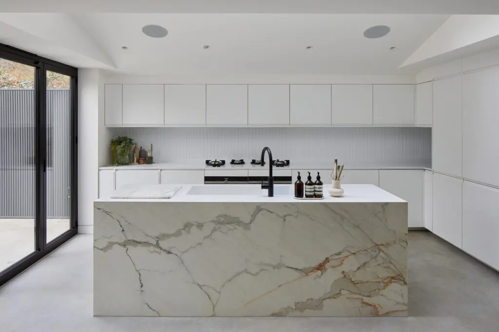 Diespeker also provided Gruff’s client with a practical, stylish Calacatta marble chopping board to match the island, and a stylish desk top in the grey Penteklion marble.