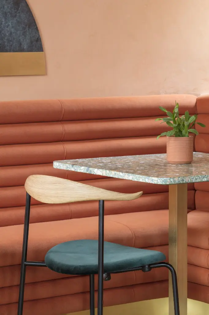 Standard plus TE074 combines orange, brown, cream and green in a sage-green base. The brief, however, called for a 4 metre, curved bar without joints. Cue Diespeker’s bespoke team. The terrazzo design was recreated as a moulded single piece in the factory.