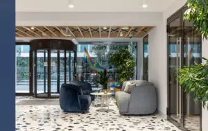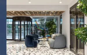 Diespeker’s contribution came under the ‘bold’ rule with a bespoke floor for the reception area. The brief was for a ‘noisy’ floor – the ‘main event’ for tenants and visitors to the building.