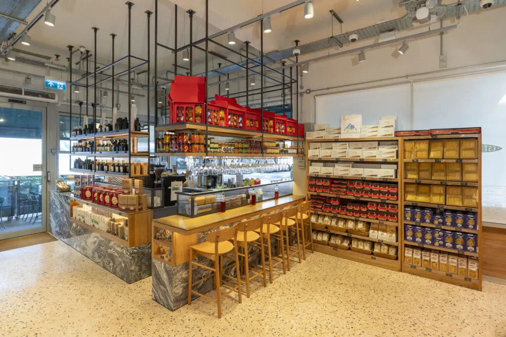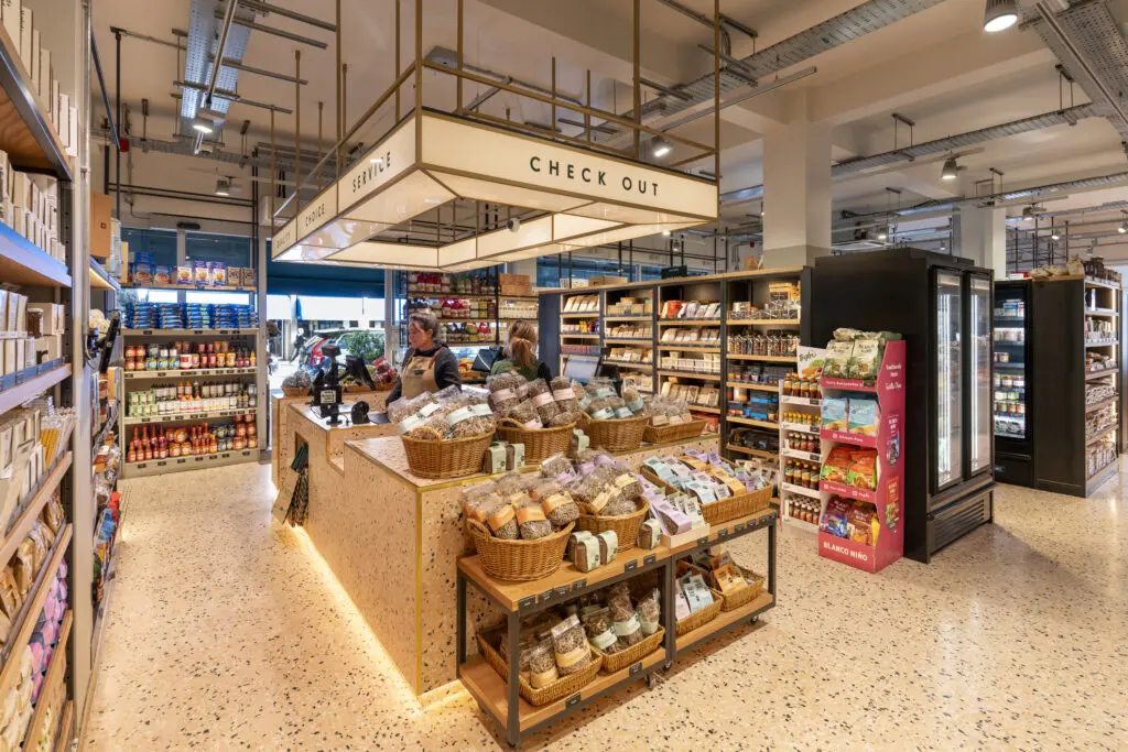 The cashier and deli counter were fully clad in the same terrazzo, including down stands and worktops. Further waterjet cut brass details included edging for the countertops and sides, and strips where customer baskets are placed at the cashier counter.