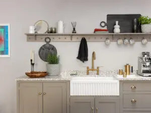 The attractive combination of traditional cabinetry and contemporary terrazzo design combine perfectly to make this a kitchen unit that sits well with the beautiful collection in Soho Home!