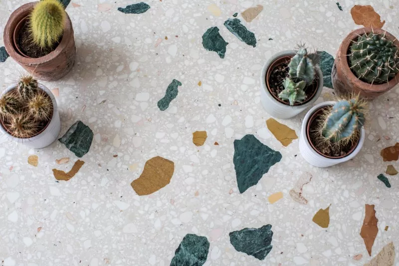 One of the recent additions to our terrazzo range is the funky TE081. It has a cream base with large chunks of marble in strong colours including greens, oranges and yellows and smaller chippings in white and pink. It’s one of the more attention-grabbing terrazzo designs in our extensive range, ideal for customers who want to add some pizazz to their home or commercial premises.