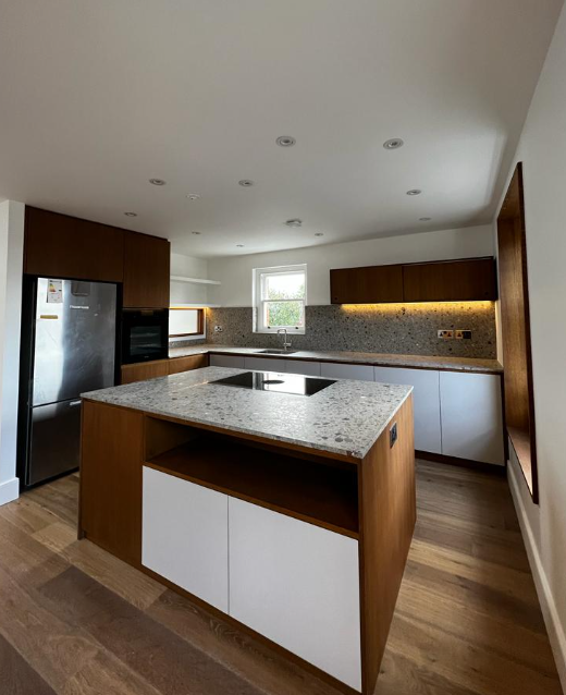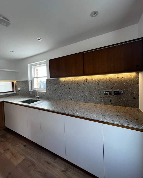 From an early stage, terrazzo was their choice for the kitchen worktops and splashbacks. Erik and Valentino knew of Diespeker as they’d worked with us when they purchased their original flat. Although they viewed designs from several suppliers, on contacting Diespeker, they were given the option to be one of the first to use a recently introduced design, TE147. This resin terrazzo has a neutral profile but plenty of interesting accents, mixing up largish chunks in varying shades of browns, greys and whites in a beige grey background. They really loved the warmth of the colour palette and how this paired with the oak of both the floor and the cabinetry.