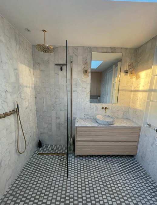 For the ensuite bathroom they had a very specific ambition; to bring something of Venice into their home. Being fans of Italian architect Carlo Scarpa and knowing his fabulous flooring in the Olivetti showroom in St Mark’s Square, they were keen to create something with a similar vibe for the bathroom floor. Diespeker has produced such flooring before, but this design has a very unique, individual feel. Diespeker’s artisan team made up a bespoke sample so Erik and Valentino could ensure it would work within their design.