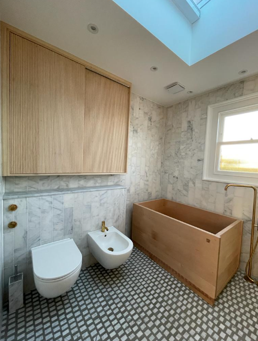 The bathroom was further inspired by a very different country, Japan, where Erik has spent a good deal of time. The bath is made from the wood of a Japanese cypress tree called ‘Asnaro’ which is not just resistant to water but emits a wonderful fragrance. The brass Vola taps are deliberately unlacquered. Erik explains, “We like the idea of things ageing, it’s part of the reason we chose terrazzo, as it develops its own character with time.”