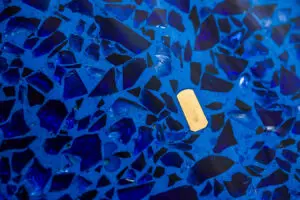 For this project, the terrazzo team came up with a number of unique terrazzo/chipping combinations to give the client the effect they desired, including an unusual bright blue base to give the effect of Lapis. The blue colouring was sourced in America, with glass chippings imported from Canada. In addition, brass rods were cut into 5mm lengths and painstakingly bonded item by item to the mould by hand.