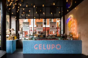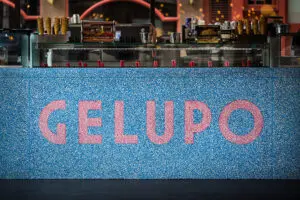 As well as the fountain, Diespeker made two stunning counter top units for the ice cream parlour, one in bespoke light blue with pink infill terrazzo spelling the name, Gelupo, and the other in a bespoke yellow terrazzo.