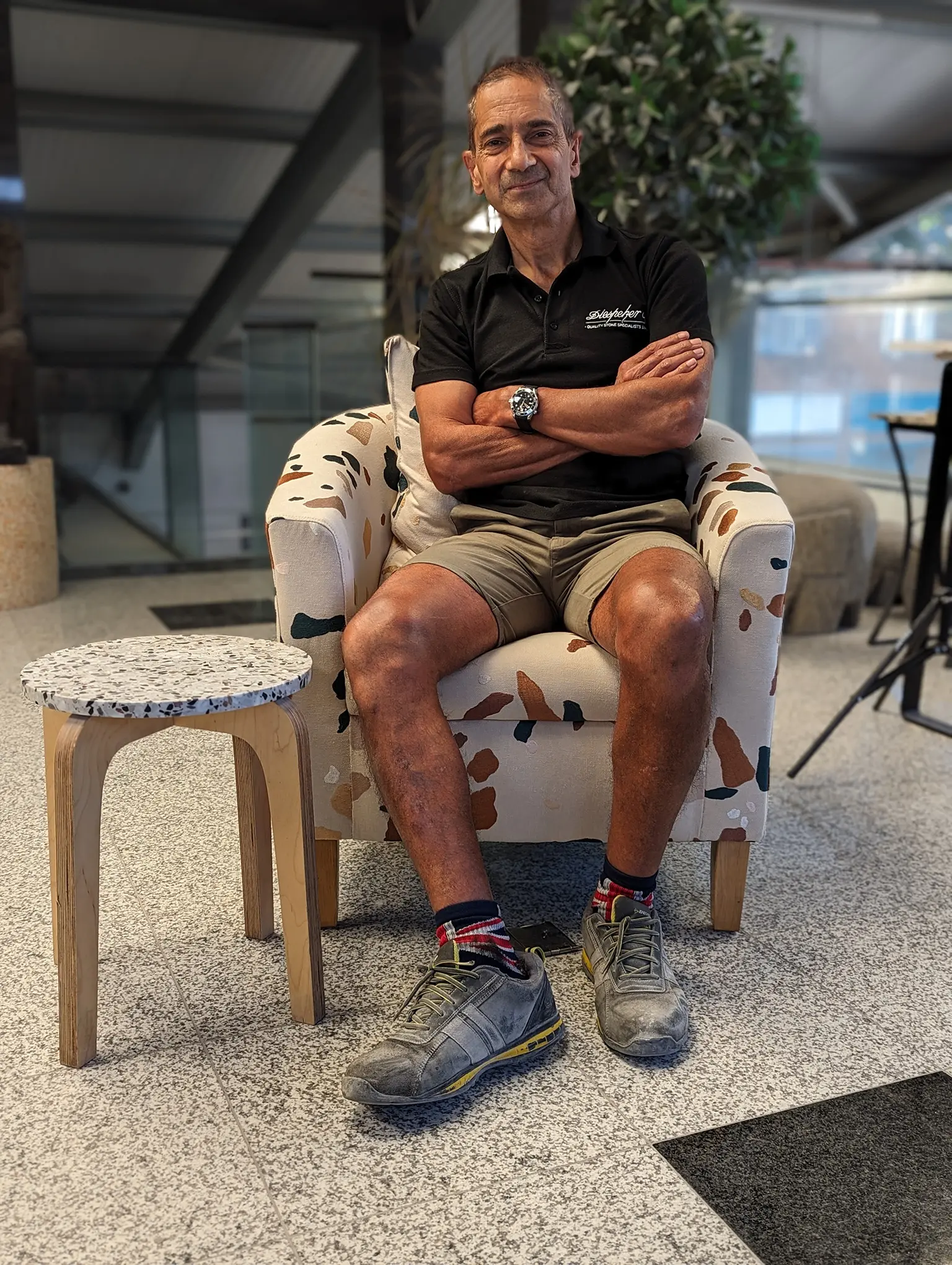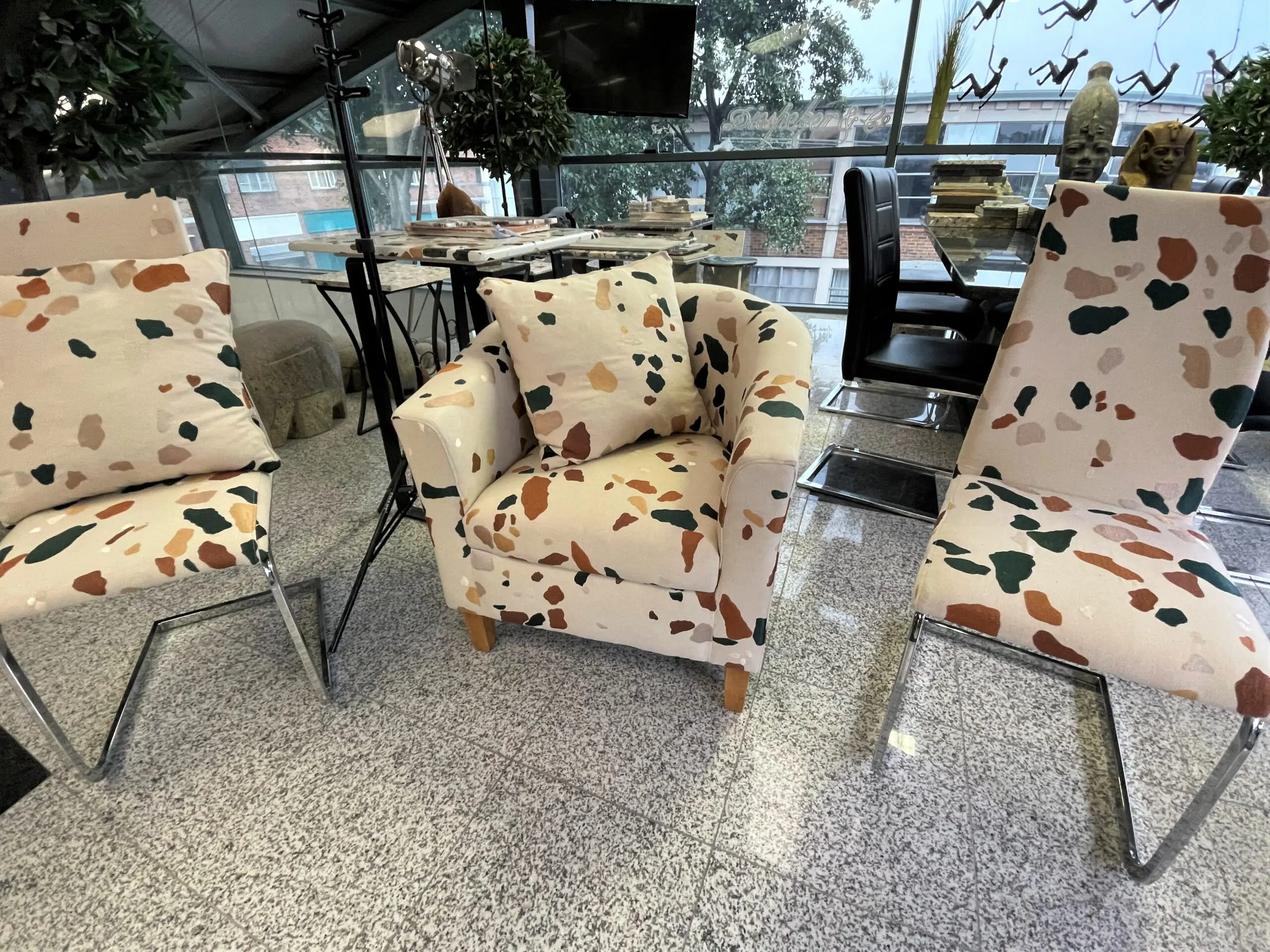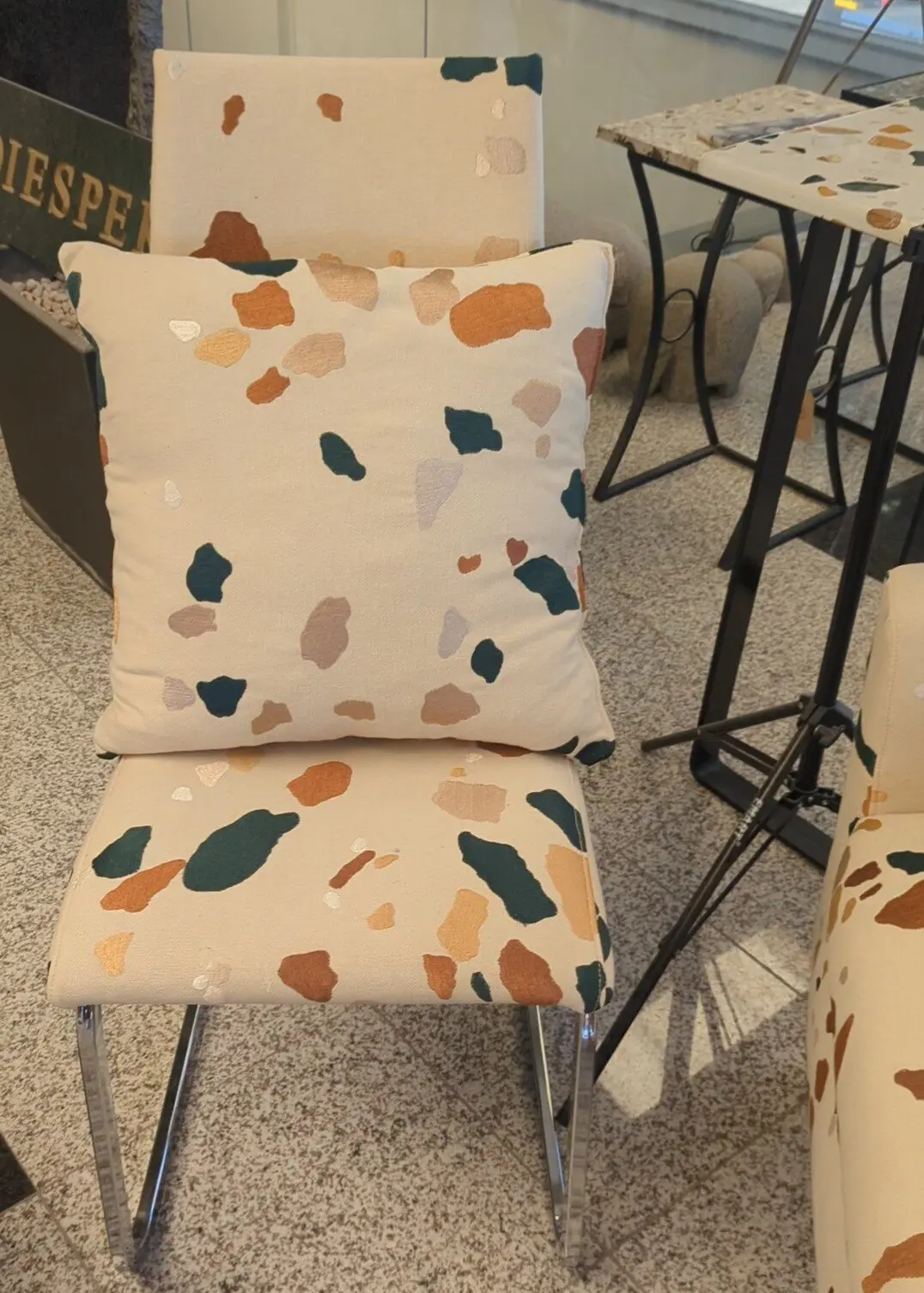 The material had been commissioned from India by one of our clients who had so loved her Diespeker TE081 that she wanted to use it for soft furnishings. Not one to miss out on an opportunity for anything terrazzo-related, our MD John Krause asked the client to have a little extra made.