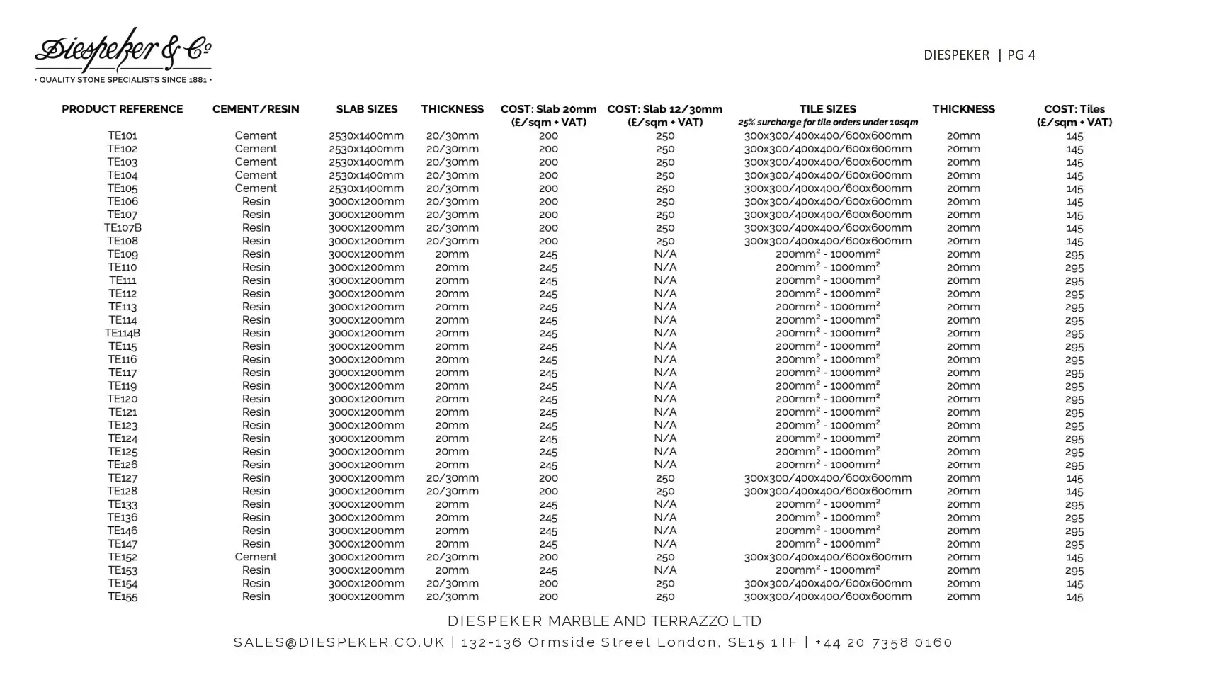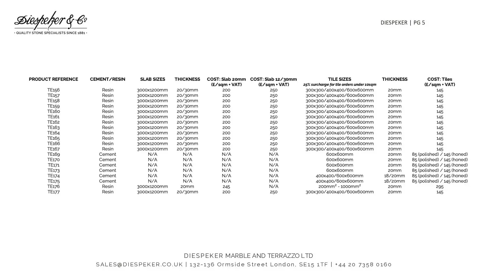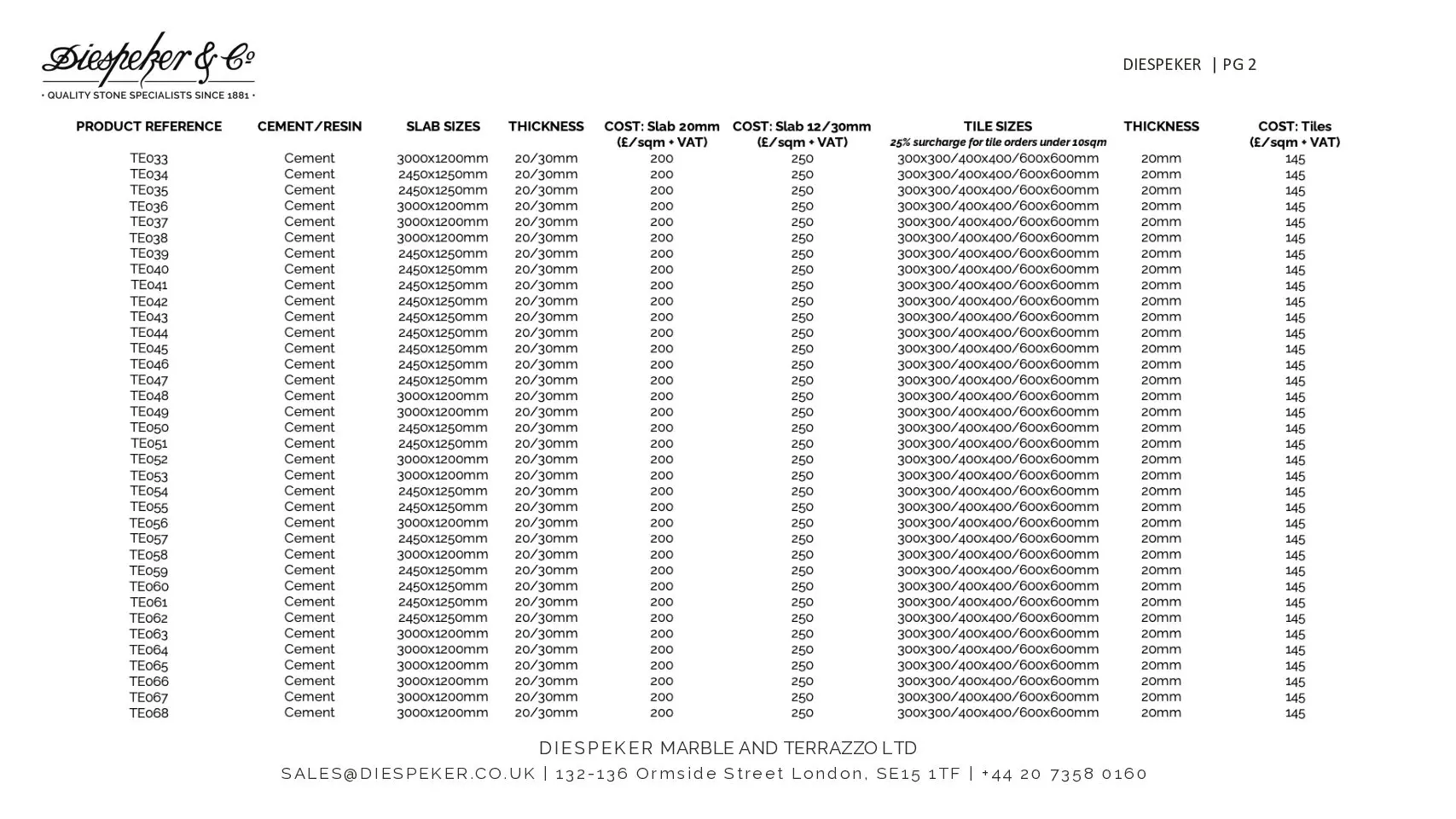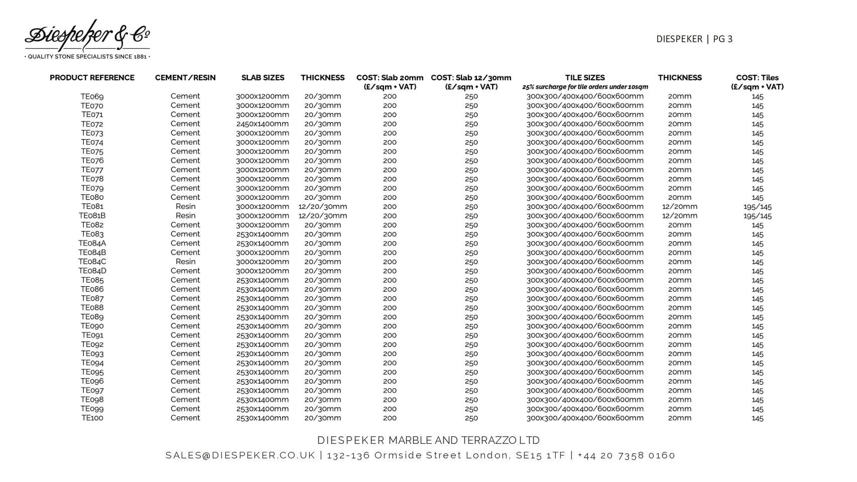 Terrazzo Price List