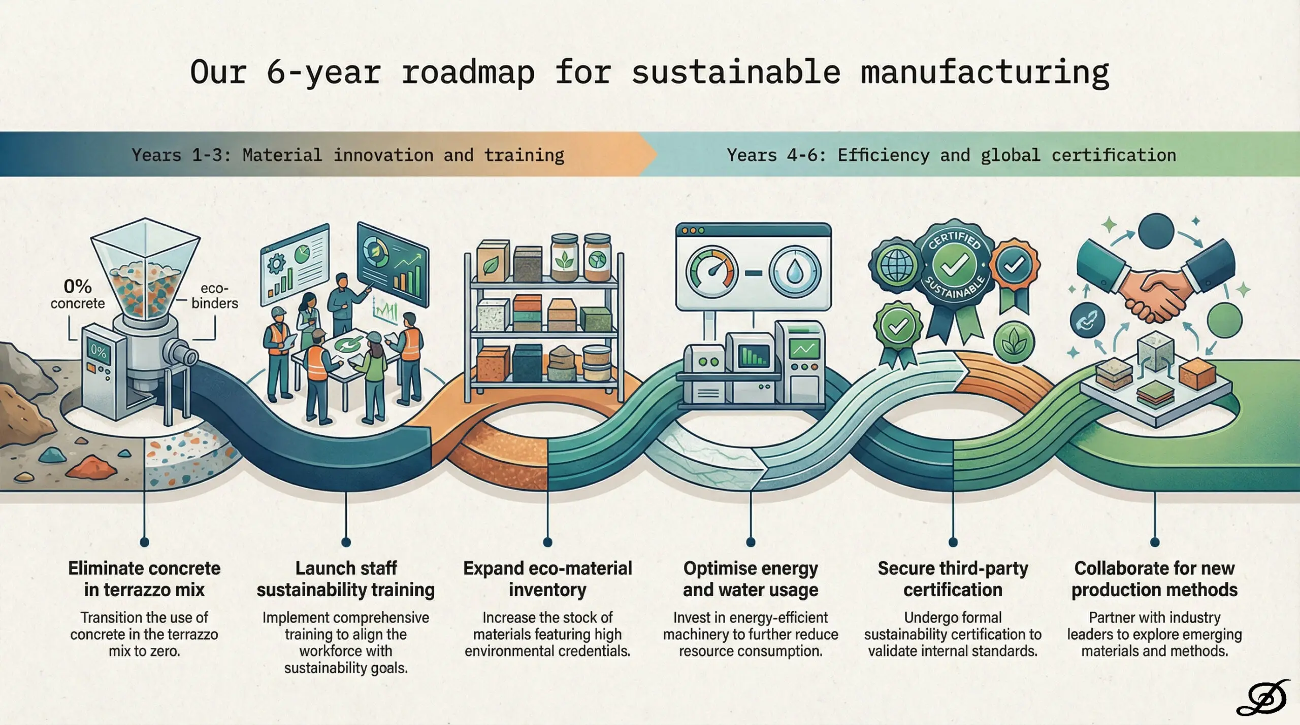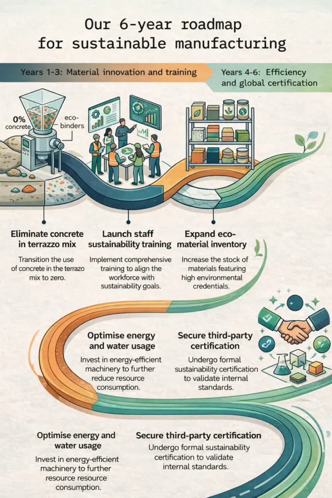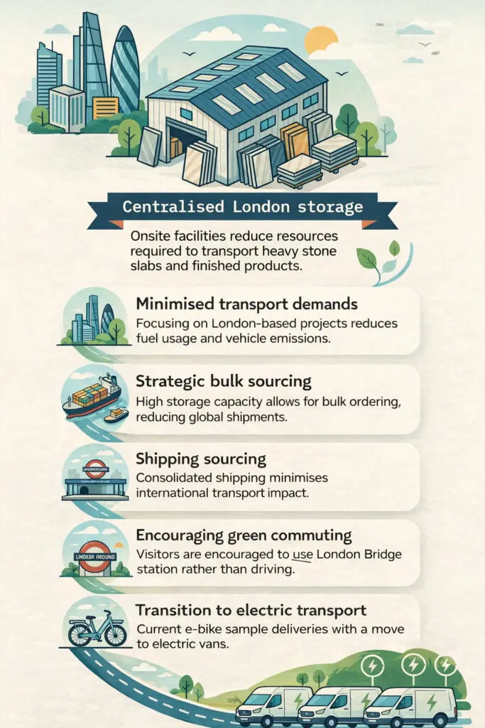 As a leading provider of natural stone and bespoke terrazzo, we recognise our responsibility to minimise our environmental impact. We are committed to transparency, innovation, and action, avoiding any form of “greenwashing.”
